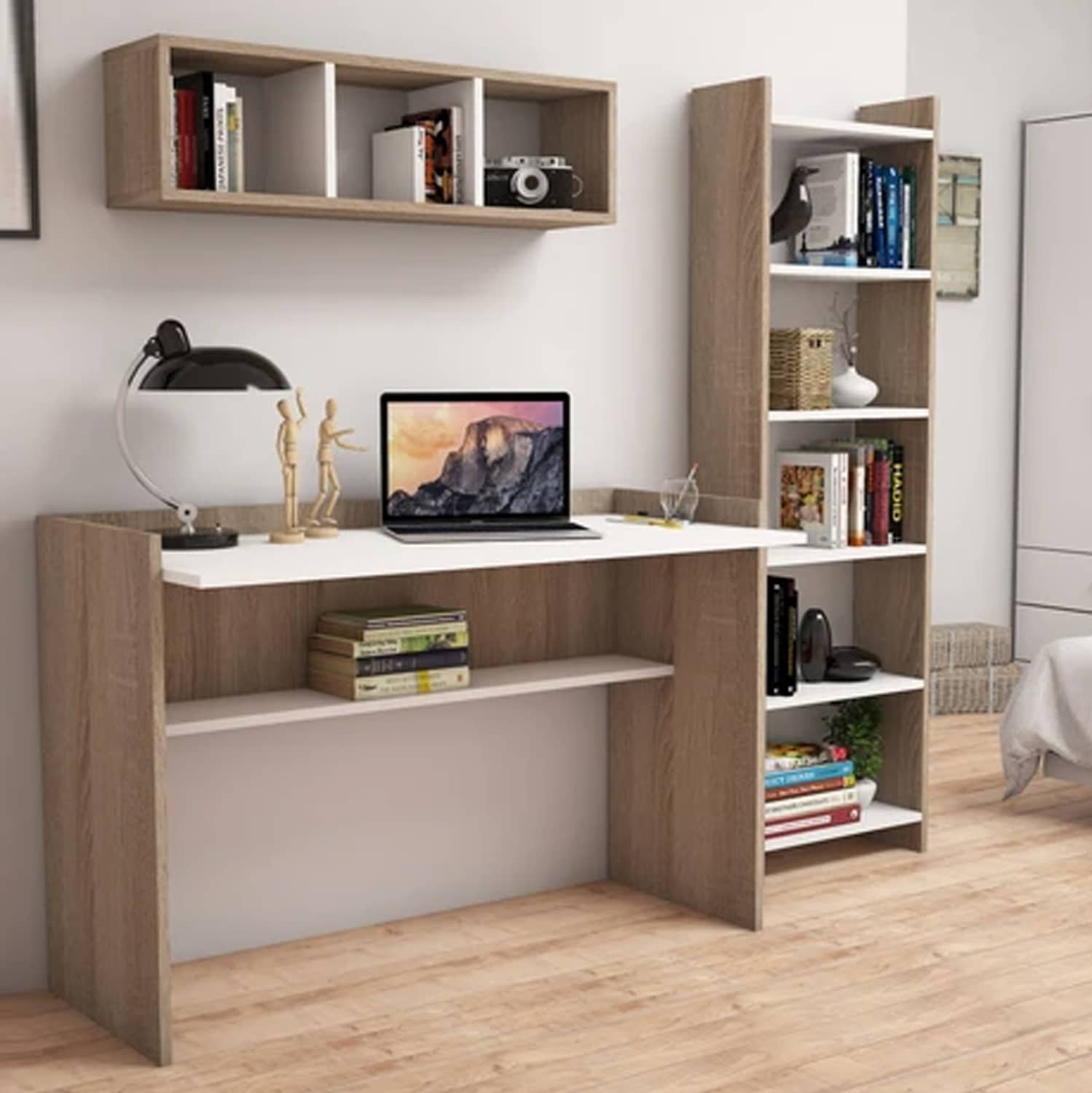 Σετ γραφείου με κομψό και λιτό σχεδιασμό, αποτελούμενο από γραφείο, ραφιέρα τοίχου και βιβλιοθήκη, κατασκευασμένα από ανθεκτική μελαμίνη πάχους 18 χιλιοστών υψηλής ποιότητας, σε sonama απόχρωση με λευκές λεπτομέρειες.