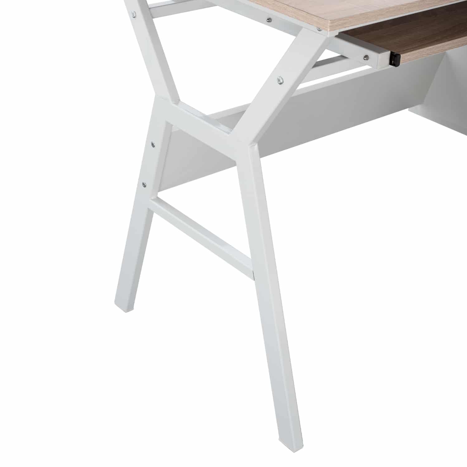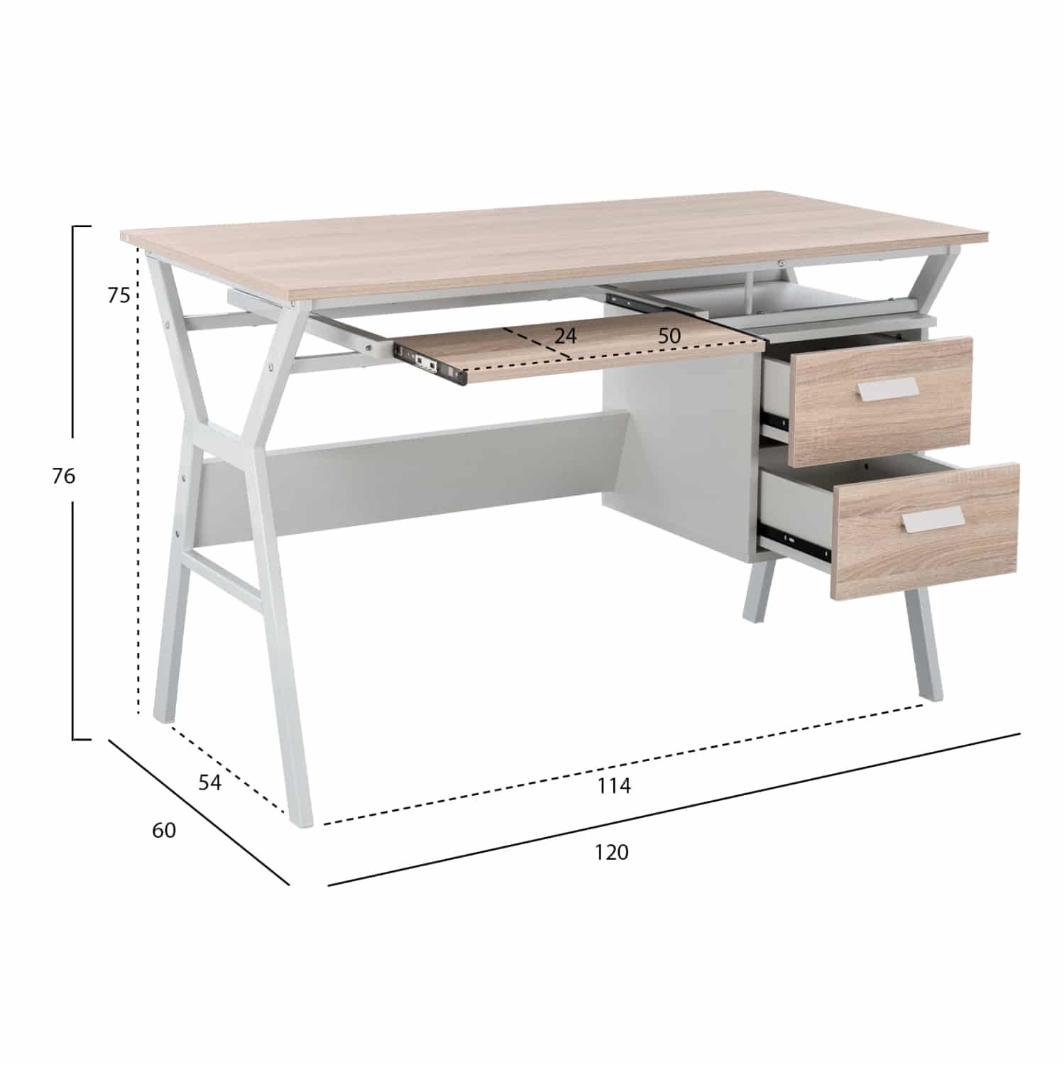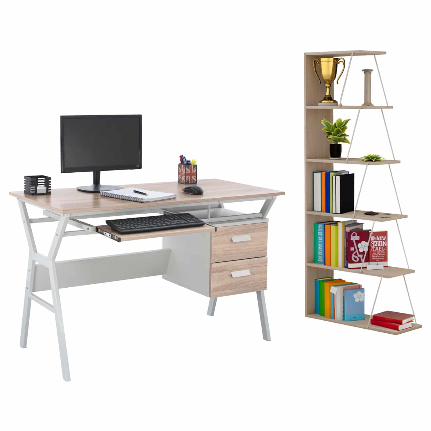 Σετ γραφείου με κομψό και λιτό σχεδιασμό, αποτελούμενο από γραφείο και βιβλιοθήκη, κατασκευασμένα από ανθεκτική μελαμίνη υψηλής ποιότητας, σε απόχρωση sonoma με λευκές μεταλλικές λεπτομέρειες.