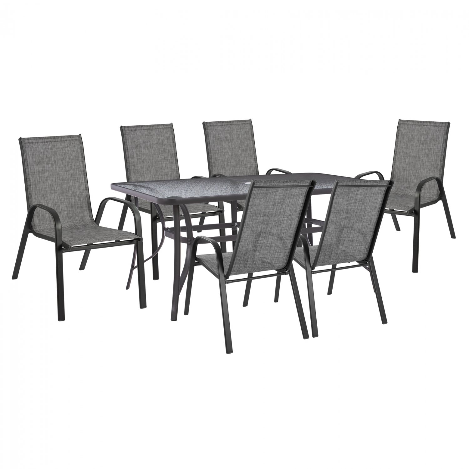 Έξι μοντέρνες πολυθρόνες εξωτερικού χώρου, κατασκευασμένες από μέταλλο σε γκρι απόχρωση με textilene 2×1 μεγάλης αντοχής σε ήλιο και βροχή.