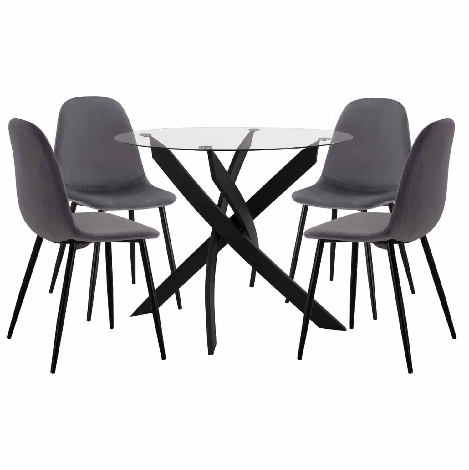 ΗΜ11095.01—Σετ εσωτερικού χώρου με στρογγυλό τραπέζι με επιφάνεια από διάφανο γυαλί ασφαλείας και μεταλλικά πόδια με μοντέρνα γεωμετρία σε μαύρο ματ χρώμα. Οι 4 καρέκλες είναι επενδυμένες με ΓΚΡΙ βελούδινο ύφασμα και έχουν ΜΑΥΡΑ μεταλλικά πόδια. Ένα όμορφο σύνολο με μοντέρνα αισθητική που θα μετατρέψει την τραπεζαρία σας σε έναν ζηλευτό χώρο.