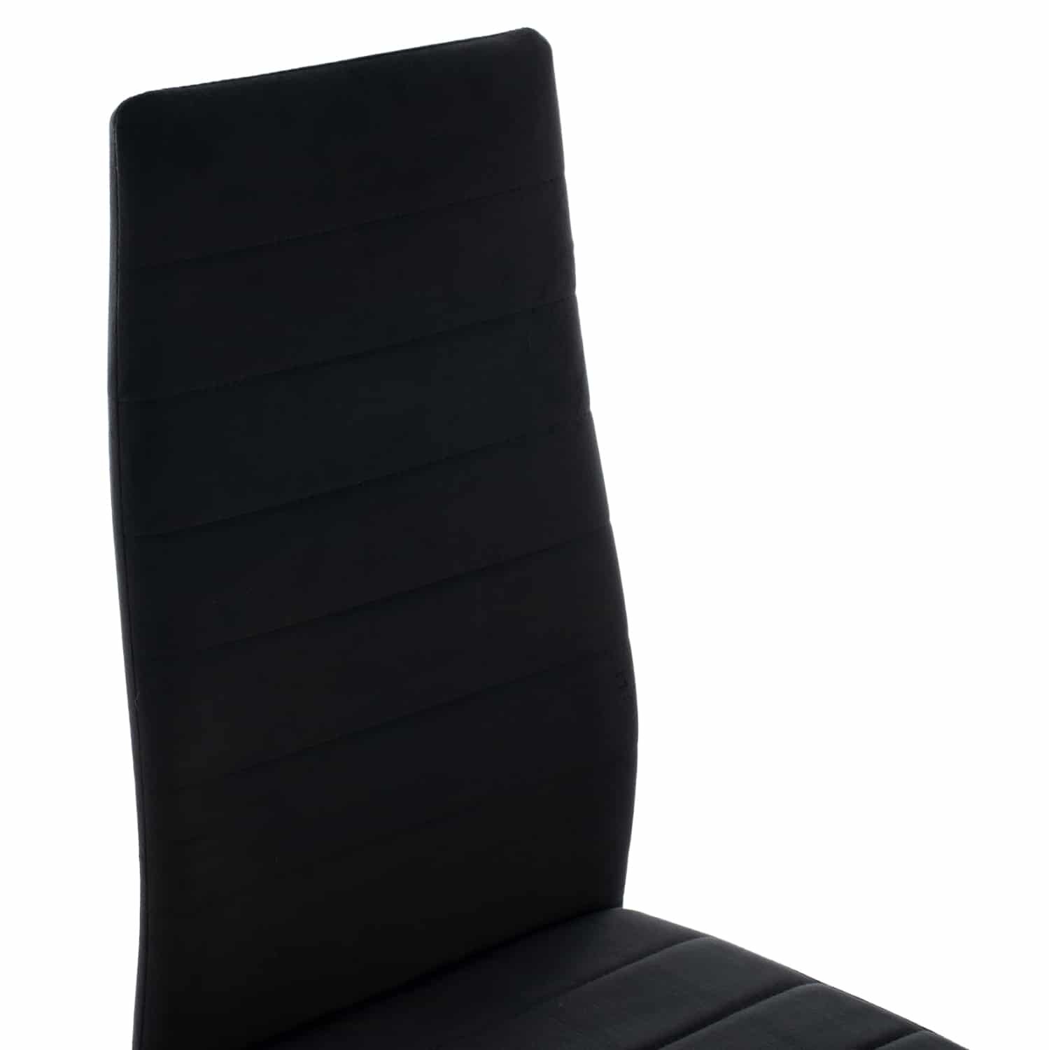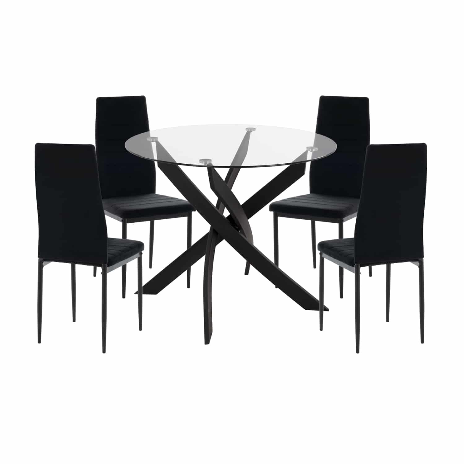 Ένα στρογγυλό τραπέζι με εκπληκτικό design με μεταλλικά πόδια σε ΜΑΥΡΟ χρώμα και γυάλινη επιφάνεια, και 4 καρέκλες με ΜΑΥΡΑ μεταλλικά πόδια και επένδυση από βελούδο σε επίσης ΜΑΥΡΟ χρώμα.