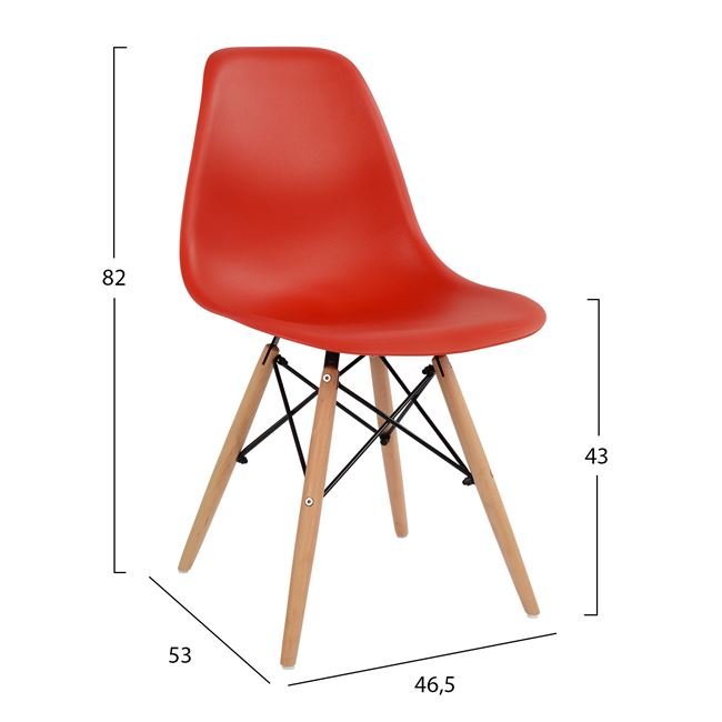 Τέσσερις Καρέκλες με ξύλινα πόδια και πολυπροπυλένιο σε κόκκινη απόχρωση. Τα πόδια της καρέκλας είναι απο μασίφ ξύλο.