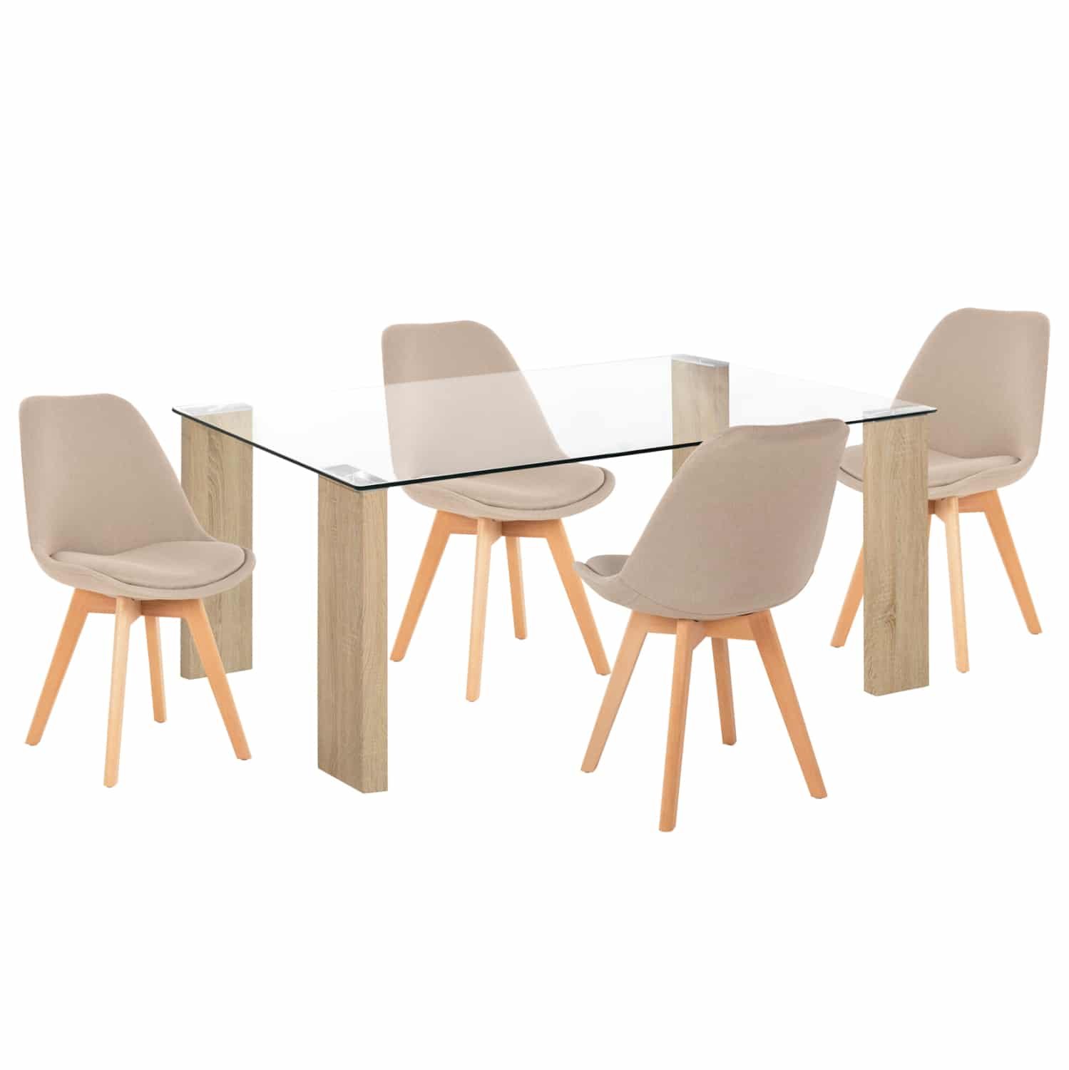 Ένα ορθογώνιο τραπέζι με πόδια από MDF σε SONAMA χρώμα και γυάλινη επιφάνεια, και 4 καρέκλες με πόδια οξιάς σε ΦΥΣΙΚΟ χρώμα και κάθισμα με μαξιλαράκι με επένδυση από ΜΠΕΖ ύφασμα.
