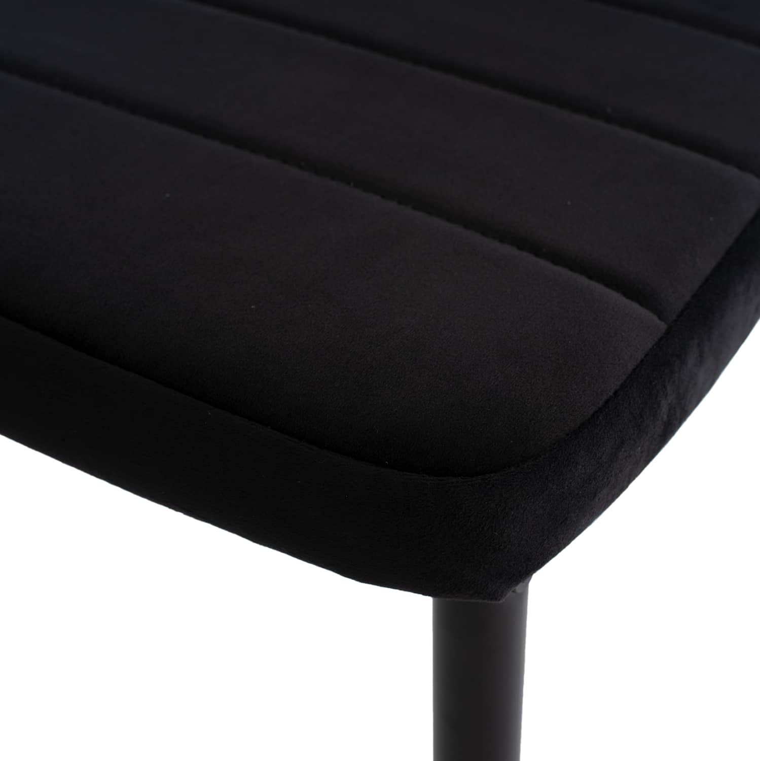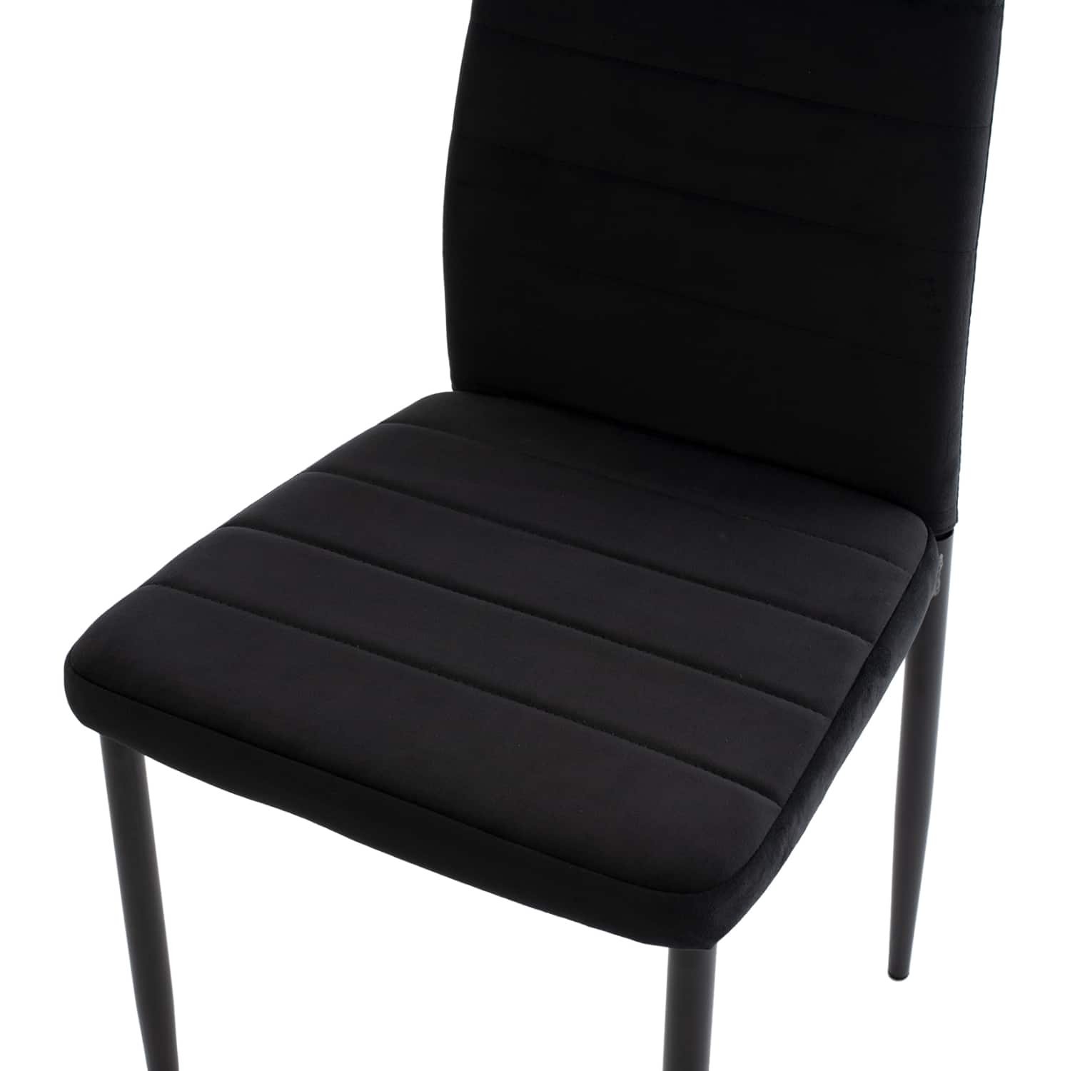 Ένα ορθογώνιο τραπέζι με σκελετό μεταλλικό σε ΜΑΥΡΟ χρώμα και κεραμική επιφάνεια με όψη ΜΑΥΡΟΥ ΜΑΡΜΑΡΟΥ, και 4 καρέκλες με ψηλή πλάτη και κάθισμα με επένδυση από βελούδινο ύφασμα σε ΜΑΥΡΟ χρώμα και μεταλλικό σκελετό σε ΜΑΥΡΟ χρώμα.