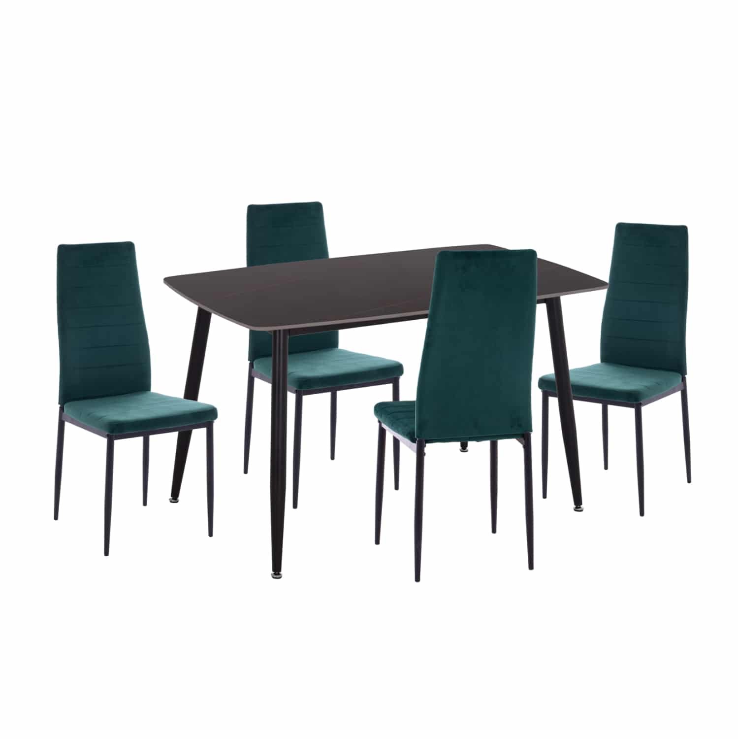 Ένα ορθογώνιο τραπέζι με σκελετό μεταλλικό σε ΜΑΥΡΟ χρώμα και κεραμική επιφάνεια με όψη ΜΑΥΡΟΥ ΜΑΡΜΑΡΟΥ, και 4 καρέκλες με ψηλή πλάτη και κάθισμα με επένδυση από βελούδινο ύφασμα σε χρώμα ΚΥΠΑΡΙΣΣΙ και μεταλλικό σκελετό σε ΜΑΥΡΟ χρώμα.
