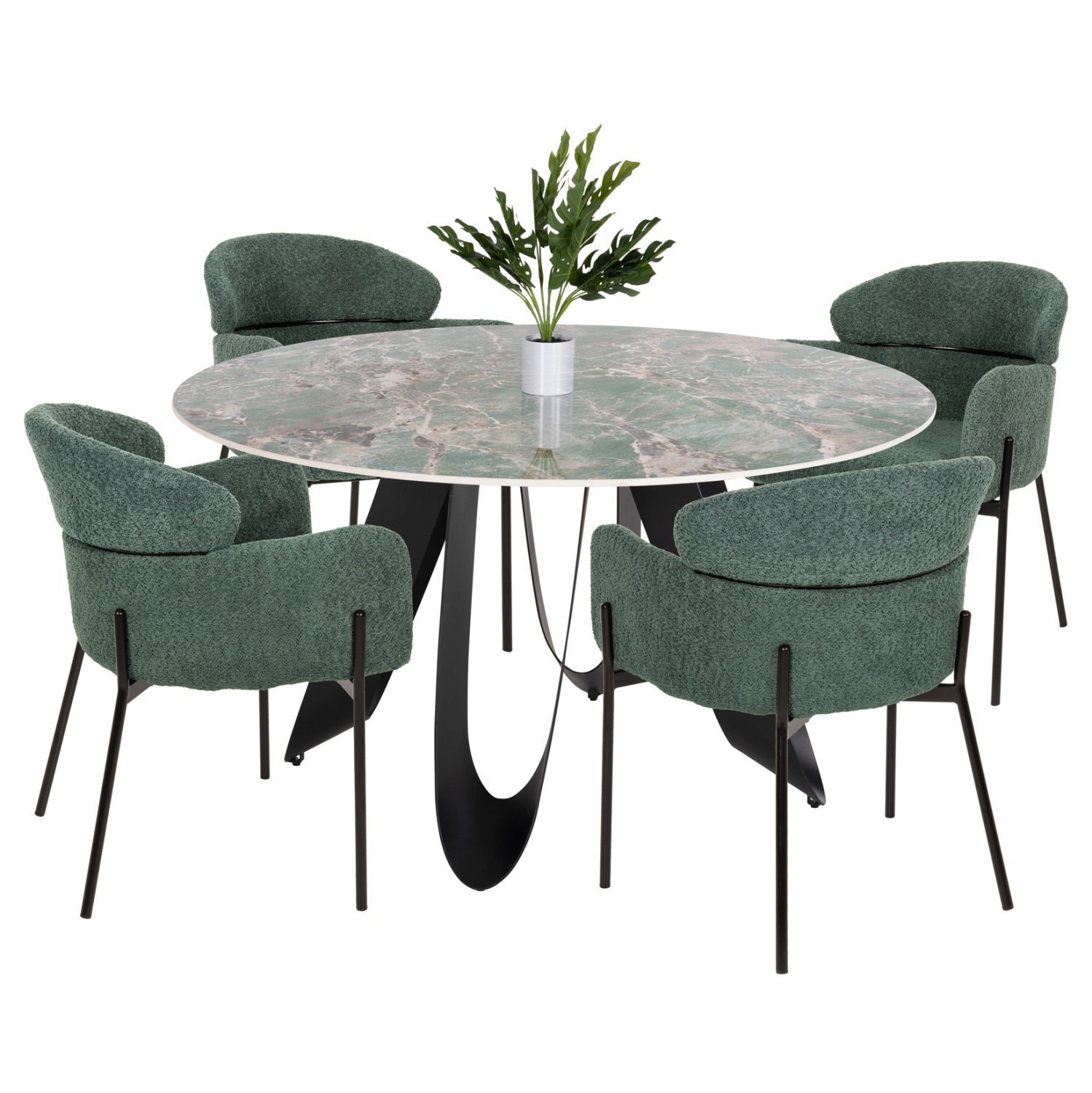 Αυτό το σετ τραπεζαρίας εσωτερικού χώρου αποτελείται από ένα τραπέζι και 4 πολυθρόνες. Το τραπέζι είναι στρογγυλό με γυαλιστερή κεραμική επιφάνεια σε χρωματισμό ΓΚΡΙ ΜΑΡΜΑΡΟΥ, ενώ τα όμορφα πόδια είναι μεταλλικά σε ΜΑΥΡΟ χρώμα. Οι πολυθρόνες έχουν μπουκλέ ύφασμα σε χρώμα ΠΕΤΡΟΛ. Το σετ αυτό θα δώσει μια πολυτελή εικόνα σε κάθε χώρο τραπεζαρίας, είτε στο σπίτι, είτε σε επαγγελματικό χώρο.