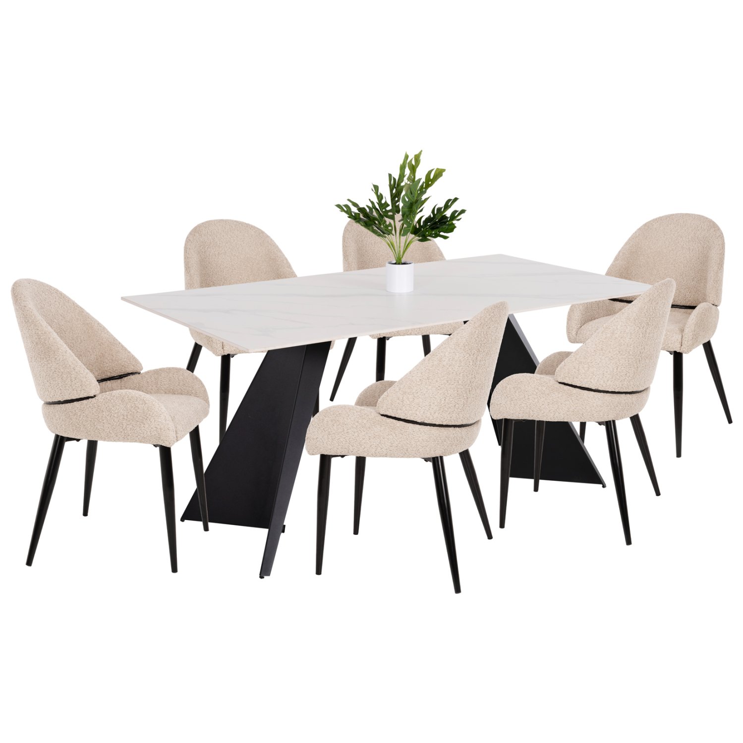 Αυτό το σετ τραπεζαρίας εσωτερικού χώρου αποτελείται από ένα τραπέζι και 6 καρέκλες. Το τραπέζι είναι ορθογώνιο με γυαλιστερή κεραμική επιφάνεια σε ΛΕΥΚΟ χρώμα, ενώ τα όμορφα πόδια είναι μεταλλικά σε ΜΑΥΡΟ χρώμα. Οι καρέκλες έχουν μπουκλέ ύφασμα σε χρώμα ΕΚΡΟΥ. Το σετ αυτό θα δώσει μια πολυτελή εικόνα σε κάθε χώρο τραπεζαρίας, είτε στο σπίτι, είτε σε επαγγελματικό χώρο.
