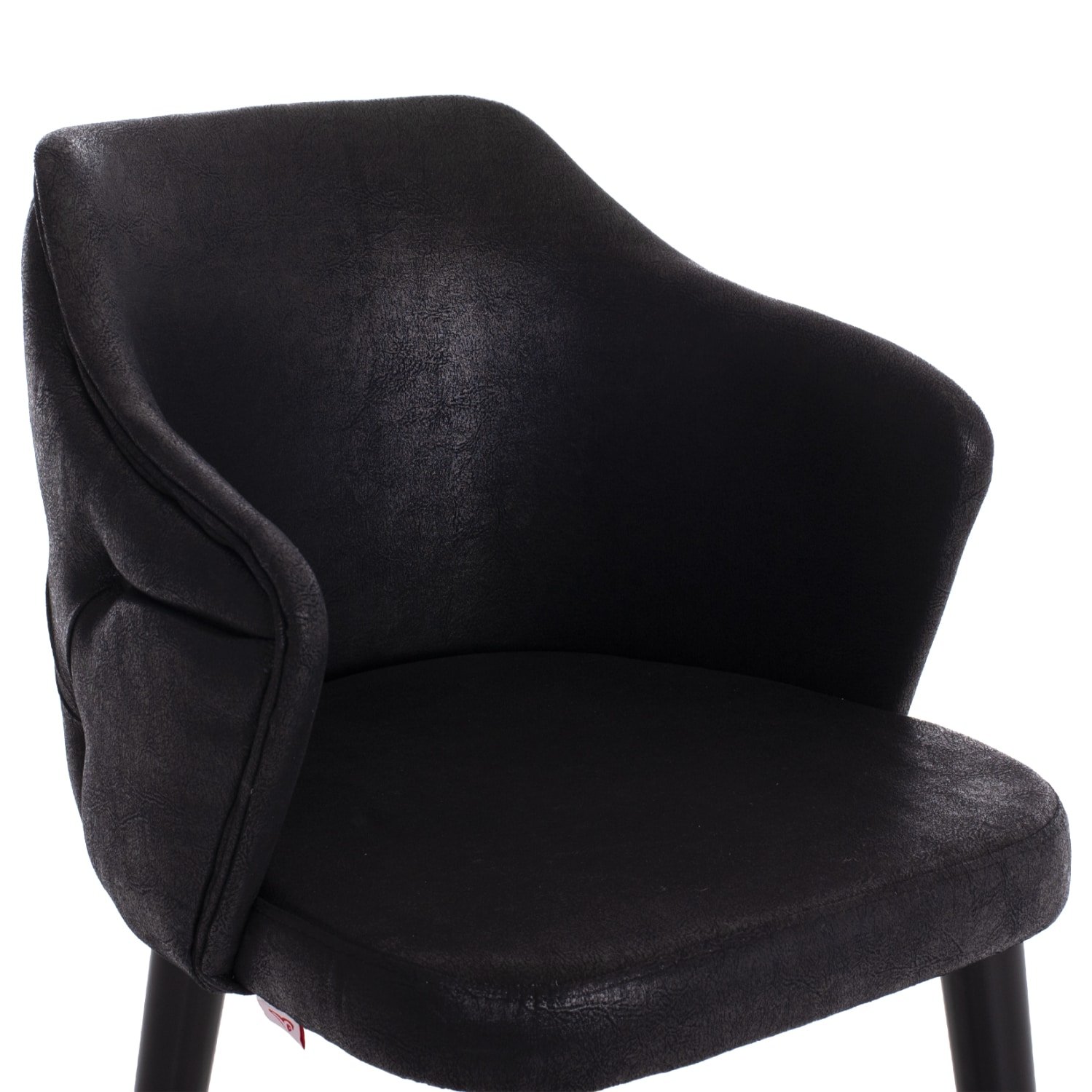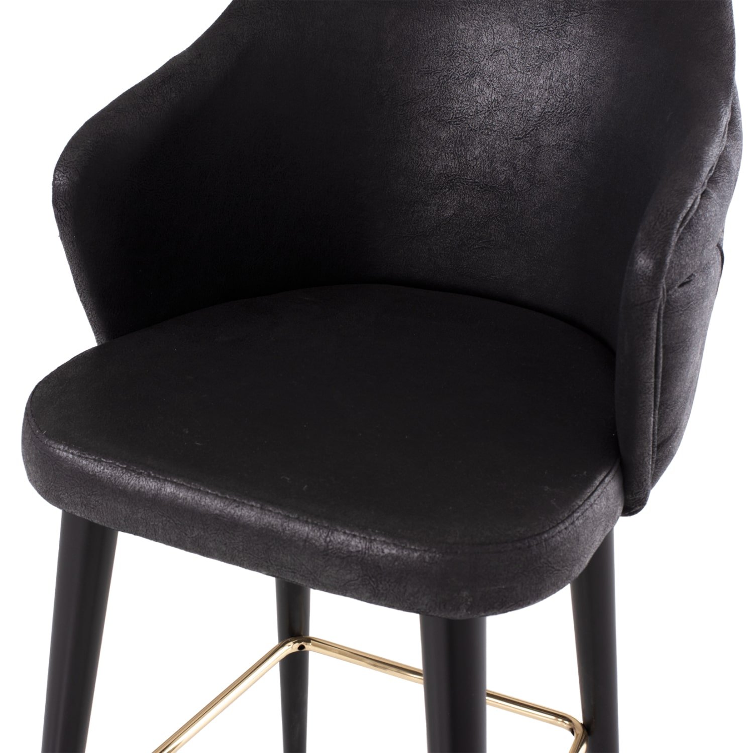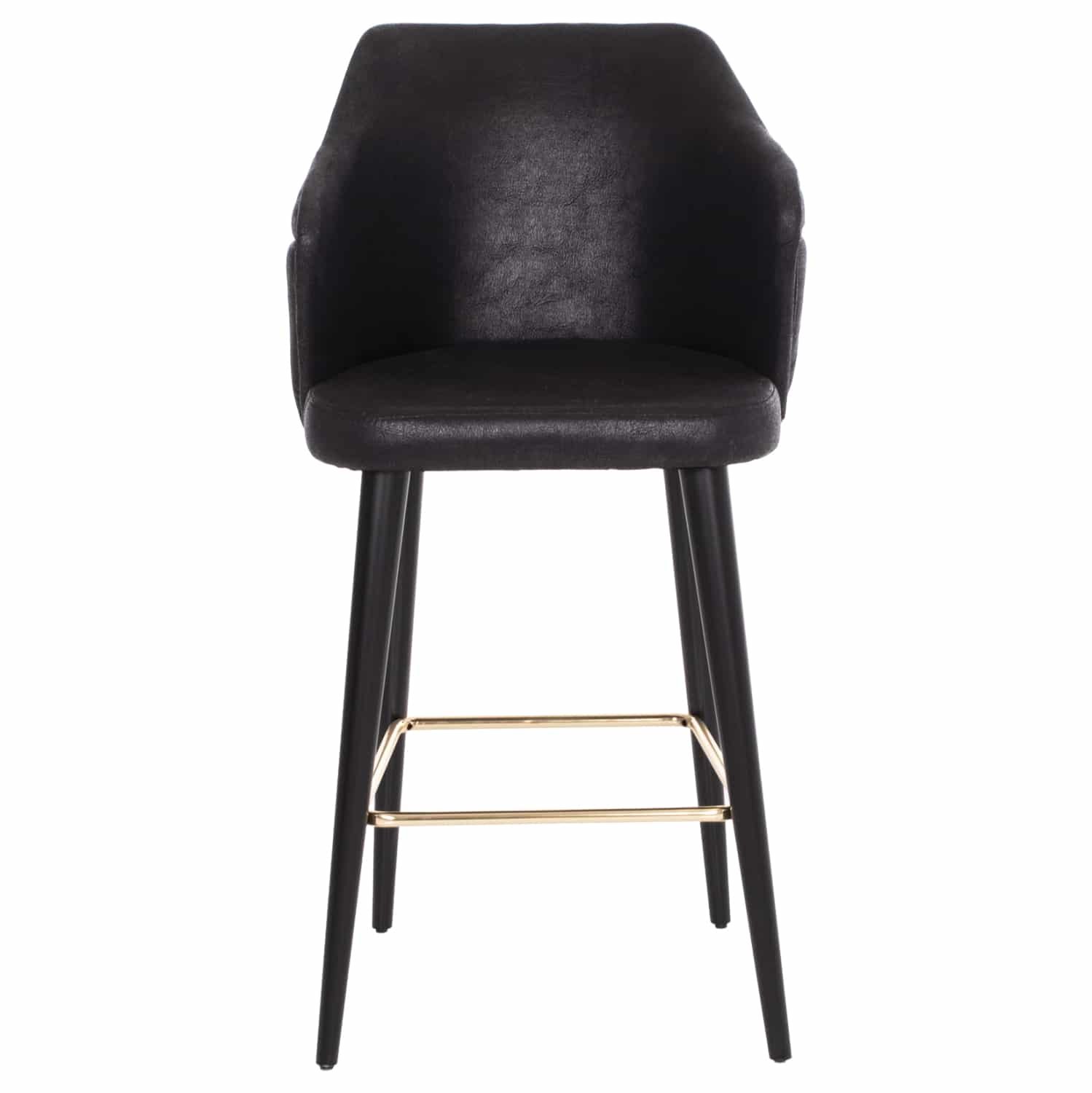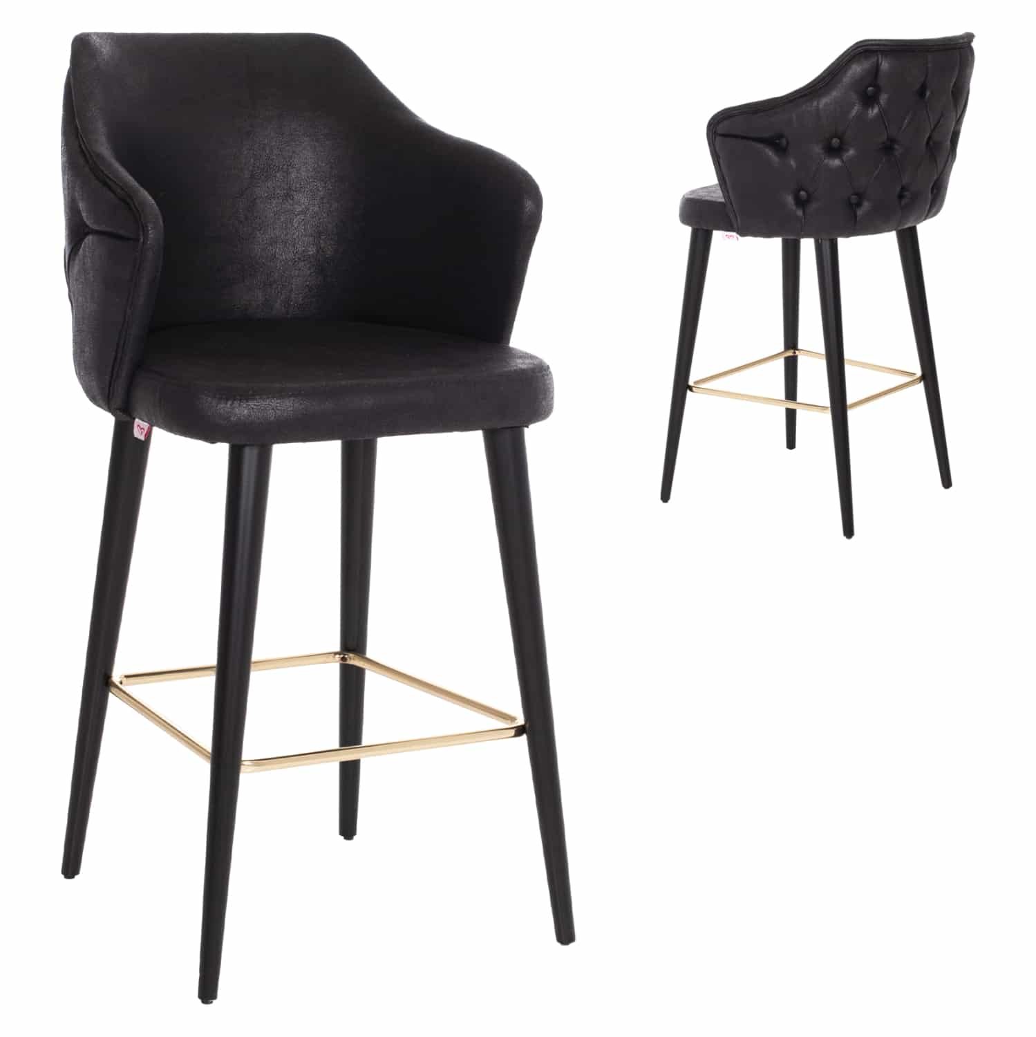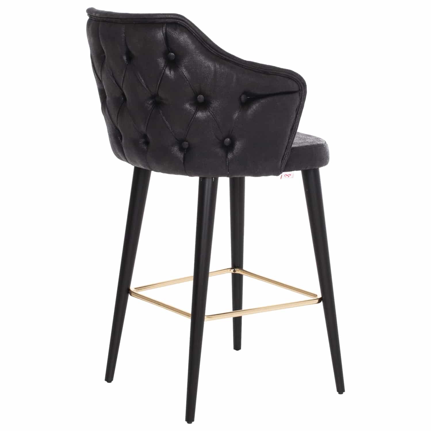 Επαγγελματικό σκαμπό bar «ALONZO” σε ΜΑΥΡΟ χρώμα με μαύρα ξύλινα πόδια. Τα πόδια ενώνονται μεταξύ τους περίπου στη μέση τους με μια μεταλλική ορθογώνια ράγα σε χρυσή απόχρωση. Το «ALONZO” είναι λιτό, ποιοτικό και κομψό στην όψη, και σίγουρα τραβάει τα βλέμματα με το ύφασμα τύπου NUBUCK που είναι επενδυμένο. Είναι ψηλό με πλάτη και μπράτσα, ενώ στο πίσω μέρος του έχει καπιτονέ τεχνοτροπία, πράγμα που επιτείνει τον ιδιαίτερο χαρακτήρα αυτού του σκαμπό.