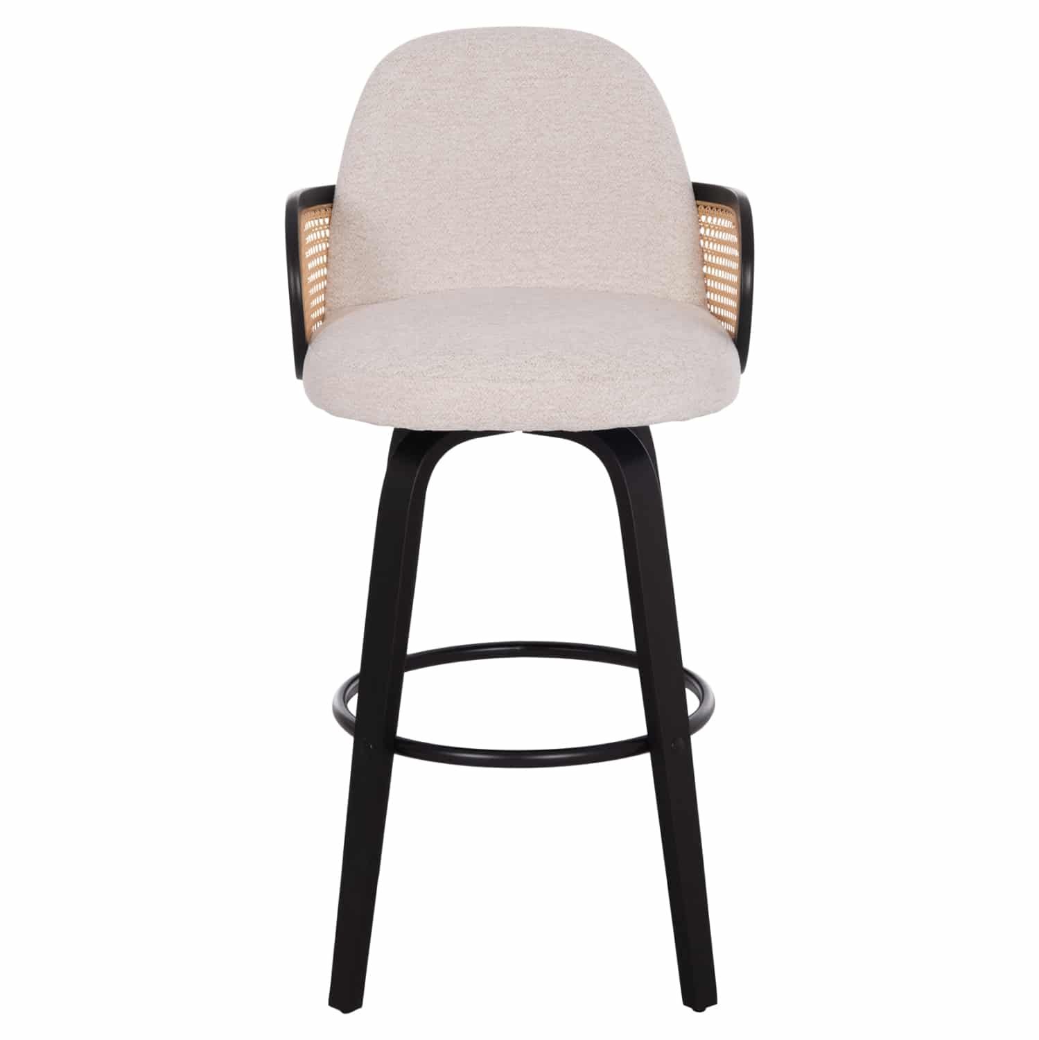 Το περιστρεφόμενο σκαμπό μπαρ BECKER αποτελεί ακόμα μια εξαιρετική πρόταση, κυρίως για επαγγελματικούς χώρους. Ο πανέμορφος σκελετός με το συμμετρικό design είναι από plywood σε επιβλητικό ΜΑΥΡΟ χρώμα, και το χαρακτηριστικό του είναι η μπεζ «σίτα» που υπάρχει στην κατασκευή των μπράτσων. Το κάθισμα και η πλάτη είναι επενδυμένα με υπέροχο ανάγλυφο ύφασμα σε ΕΚΡΟΥ χρώμα, ενώ στο κάτω μέρος των ποδιών υπάρχουν ρεγουλατόροι για ρύθμιση της σταθερότητας του σκαμπό. Διαθέτει και υποπόδιο που ενώνει τα 4 πόδια κυκλικά.