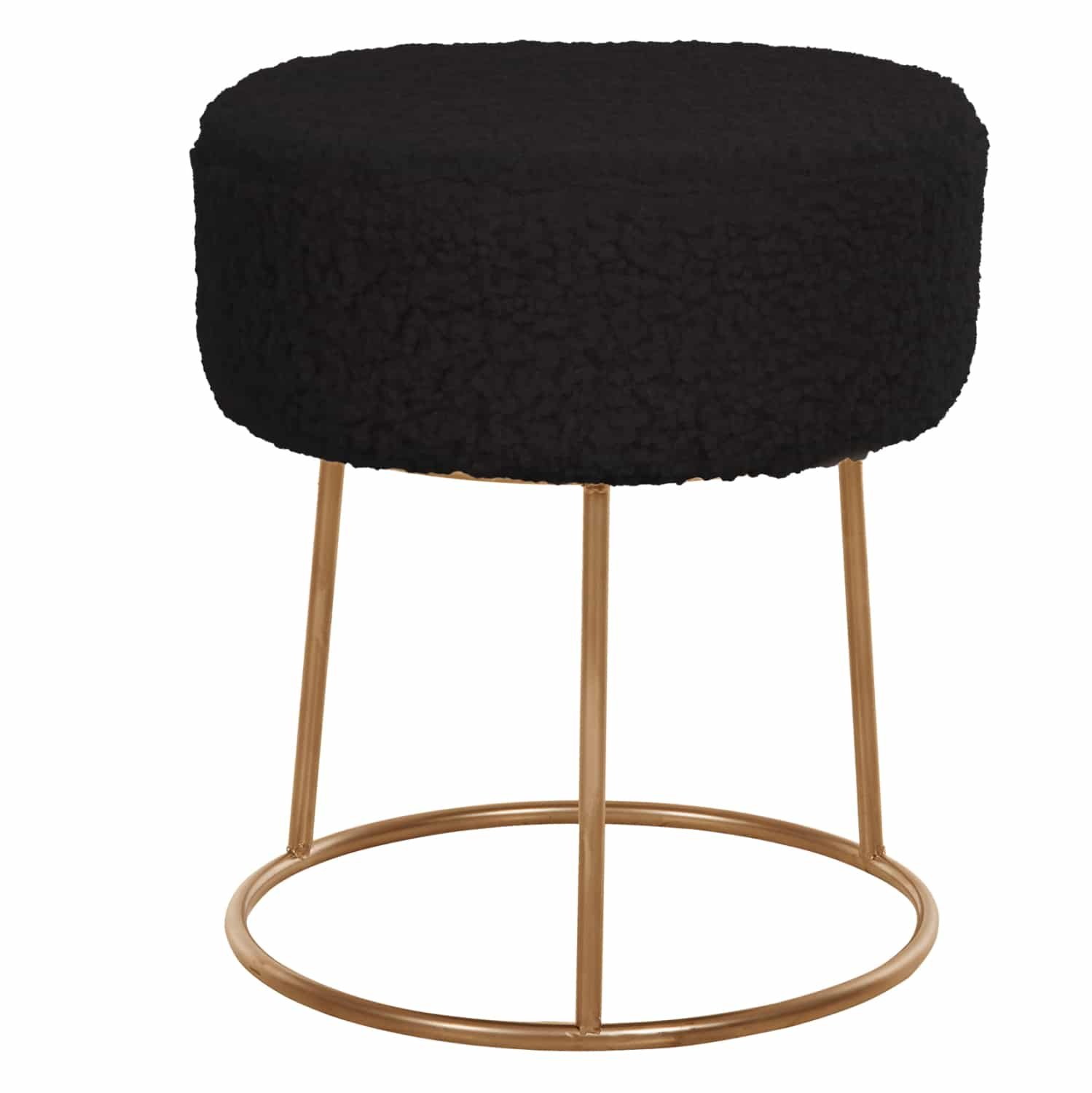 Το σκαμπό KARLO είναι μια μοντέρνα και στιλάτη πρόταση που θα αφήσει το στίγμα του σε όποιο σαλόνι κι αν τοποθετηθεί. Το στρογγυλό του σχήμα με την στρογγυλή ΧΡΥΣΗ μεταλλική βάση, σε συνδυασμό με το ζεστό μπουκλέ ύφασμα σε ΜΑΥΡΟ χρώμα, συνθέτουν ένα όμορφο και πρακτικό έπιπλο, που μπορεί να συνδυαστεί με πληθώρα άλλων χρωμάτων στην διακόσμηση του σαλονιού.