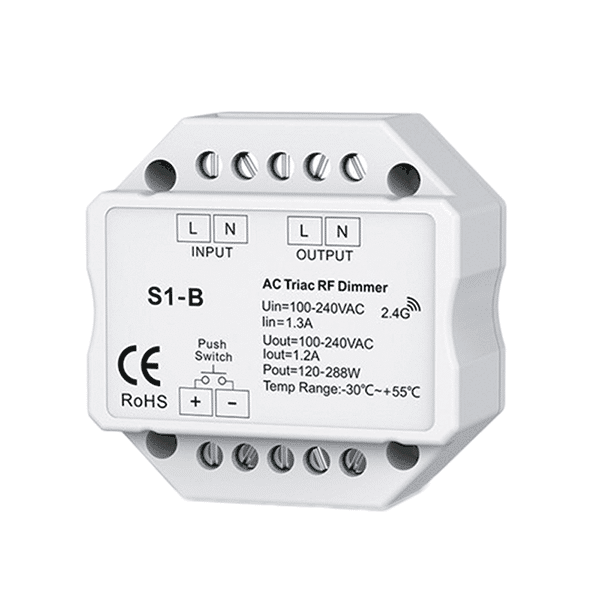 Έξυπνος μονοκάναλος ντίμερ RF τύπου TRIAC, κατάλληλος για τοποθέτηση μέσα σε κουτί παροχής (κυτίο). Παρέχει δυνατότητα ασύρματου χειρισμού μέσω RF τηλεχειριστηρίου ή εφαρμογής σε iOS/Android, προσφέροντας συμβατότητα με ευρύ φάσμα dimmable φωτιστικών. Διαθέτει επιλογή τύπου dimming (leading/trailing edge) και ρύθμιση ελάχιστης φωτεινότητας μέσω dip switch.