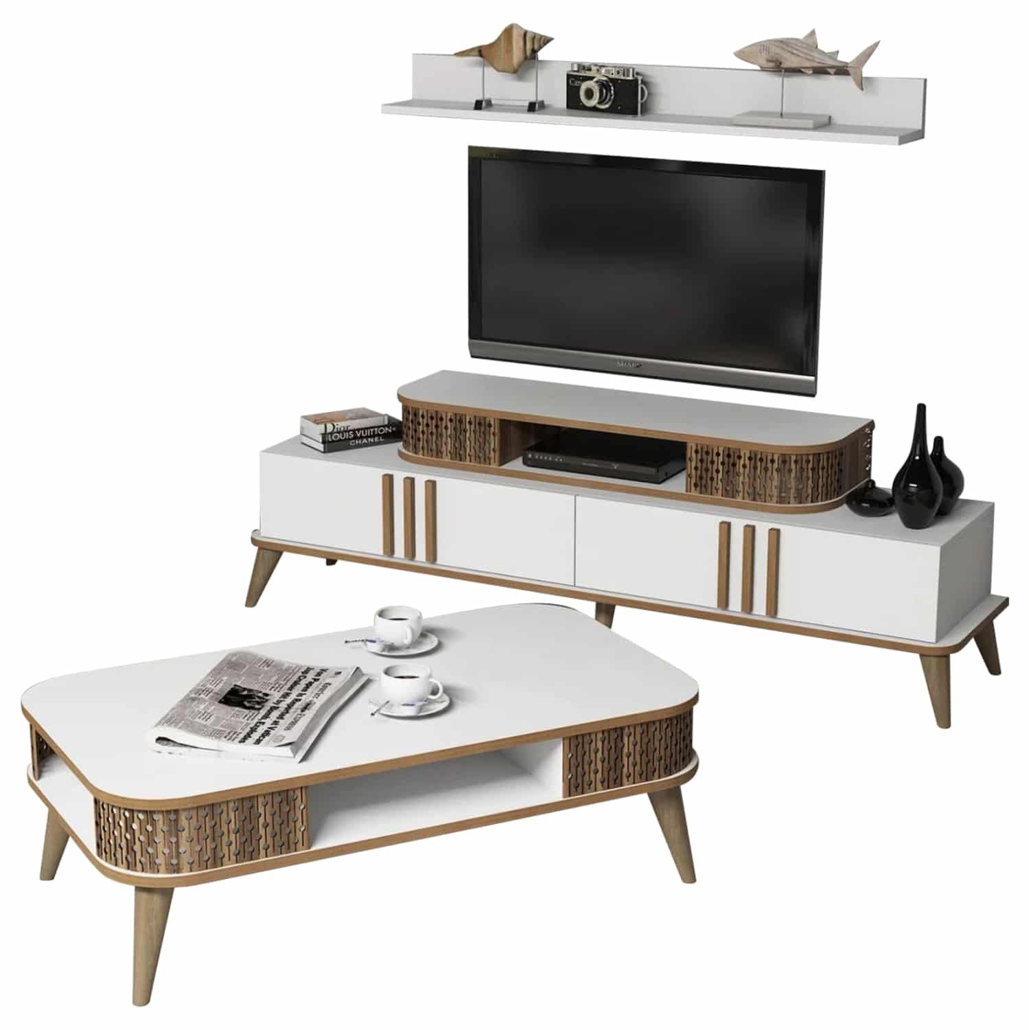 Η σύνθεση ΗΜ11848.03 θα αλλάξει την όψη στο σαλόνι σας και θα σας προσφέρει την αναβάθμιση που θέλετε. Αποτελείται από έναν συνδυασμό επίπλων για την τηλεόρασή σας με μονάδα δαπέδου και επιτοίχιο ράφι και ένα τραπεζάκι σαλονιού. Όλη η σύνθεση είναι της ίδιας σειράς και ο συνδυασμός χρωμάτων είναι το ΛΕΥΚΟ με ΚΑΡΥΔΙ.