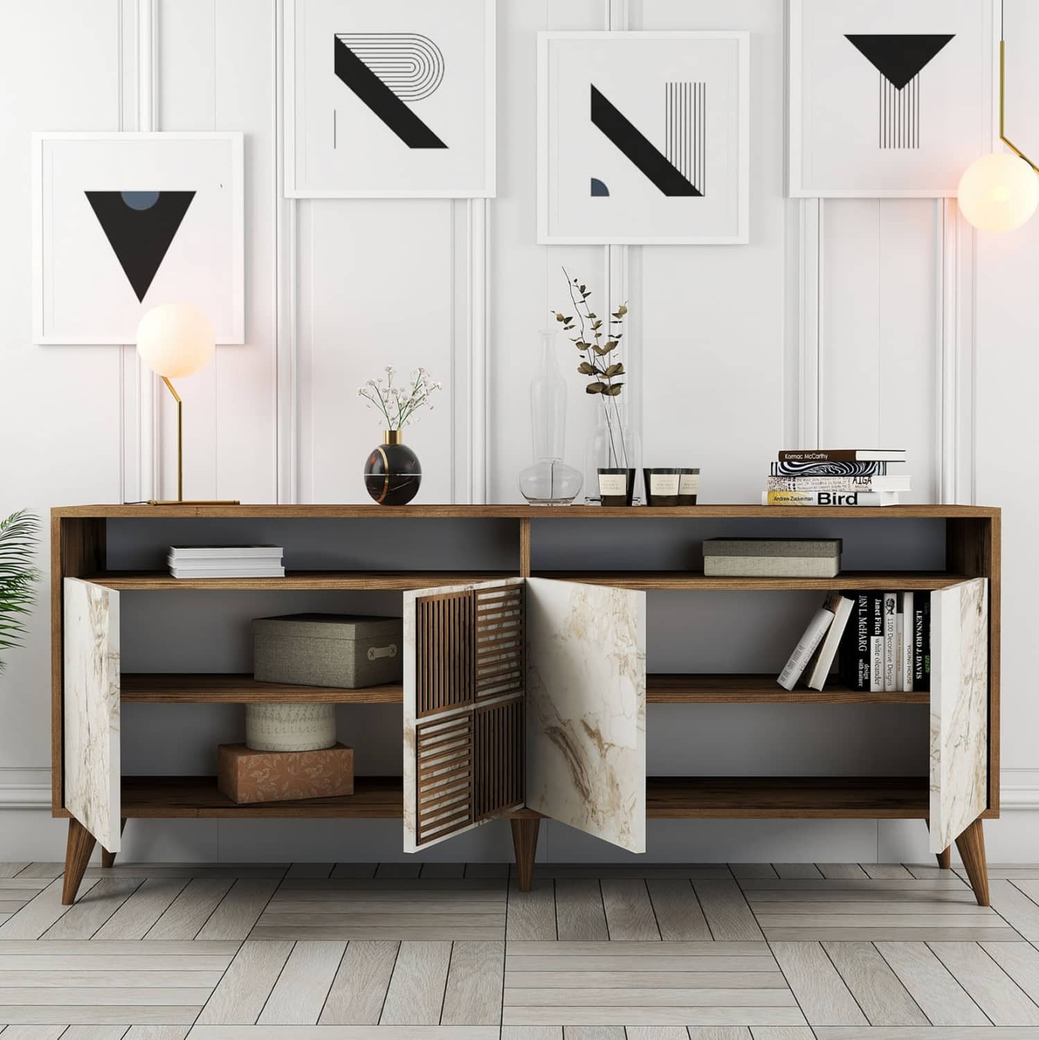 Η σύνθεση ΗΜ11845.03 θα αλλάξει την όψη στο σαλόνι σας και θα σας προσφέρει την αναβάθμιση που θέλετε. Αποτελείται από έναν συνδυασμό επίπλων για την τηλεόρασή σας με μονάδα δαπέδου και επιτοίχια ράφια, ένα τραπεζάκι σαλονιού, και έναν μπουφέ. Όλη η σύνθεση είναι της ίδιας σειράς και τα κυρίαρχα χρώματα είναι το ΚΑΡΥΔΙ και το ΛΕΥΚΟ ΜΑΡΜΑΡΟ.