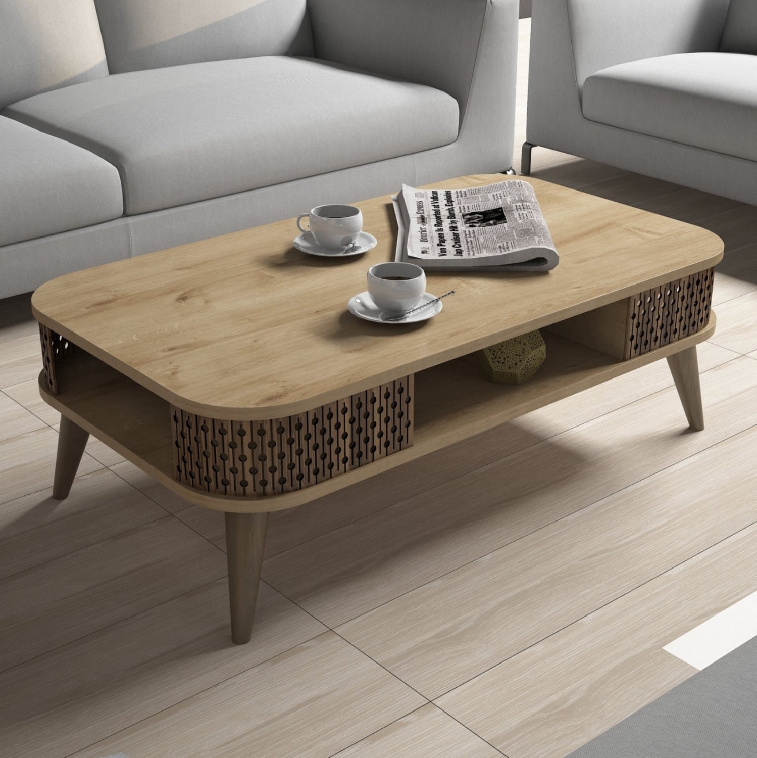 ΗΜ9501.01 τραπεζάκι σαλονιού—– Το τραπεζάκι αυτό είναι ένα όμορφο έπιπλο σε χρώμα φυσικού ΟΑΚ. Το όμορφο design του θα αλλάξει την εικόνα του σαλονιού ή του καθιστικού σας προς το καλύτερο. Πρόκειται για μια κατασκευή με μια ικανοποιητικού μεγέθους επάνω επιφάνεια. Από κάτω υπάρχουν 3 ανοιχτοί χώροι για τοποθέτηση αντικειμένων. Το χαρακτηριστικό, όμως, σε αυτό το τραπεζάκι είναι ότι οι γωνίες του είναι στρογγυλεμένες και οι καμπύλες είναι φτιαγμένες με διάτρητο σχέδιο στην μελαμίνη. Η κομψότητα, η ποιότητα και το minimal design χαρακτηρίζουν αυτό το τραπεζάκι, που έχει φτιαχτεί για εσένα.