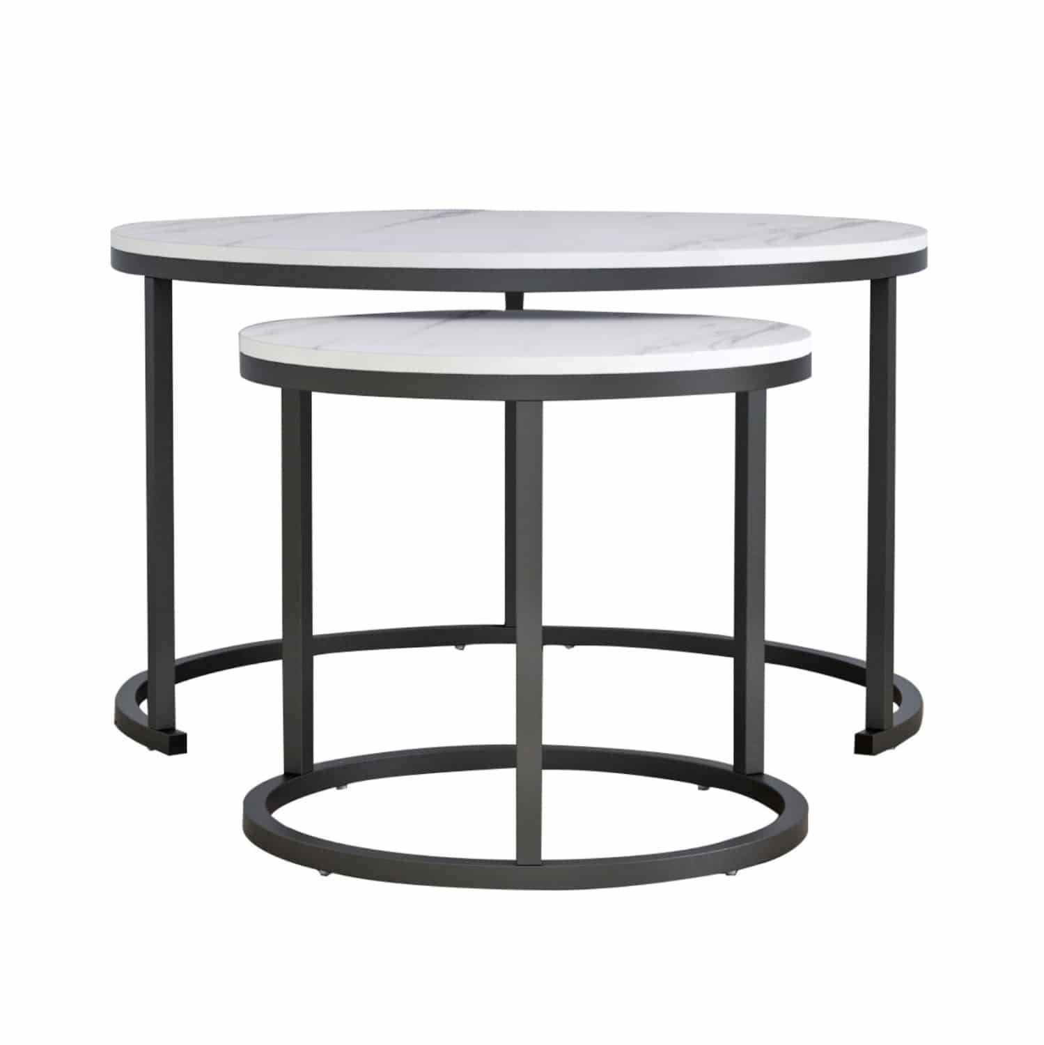 ΗΜ8763.12 τραπεζάκια σαλονιού—– Τα τραπεζάκια ΗΜ8763.12 θα σας ενθουσιάσουν με το στυλ και την πρακτικότητά τους. Πρόκειται για 2 τραπεζάκια ένα ψηλότερο κι ένα πιο κοντό με ιδιαίτερο χαρακτηριστικό ότι το ψηλότερο στηρίζεται σε μια ημικυκλική βάση με τρία μεταλλικά πόδια, πράγμα που επιτρέπει στο πιο κοντό να χωράει και να αποθηκεύεται ακριβώς από κάτω. Οι βάσεις και των δύο τραπεζιών είναι μεταλλικές σε μαύρο χρώμα, ενώ οι επιφάνειές τους είναι σε απομίμηση λευκού μαρμάρου από MDF.