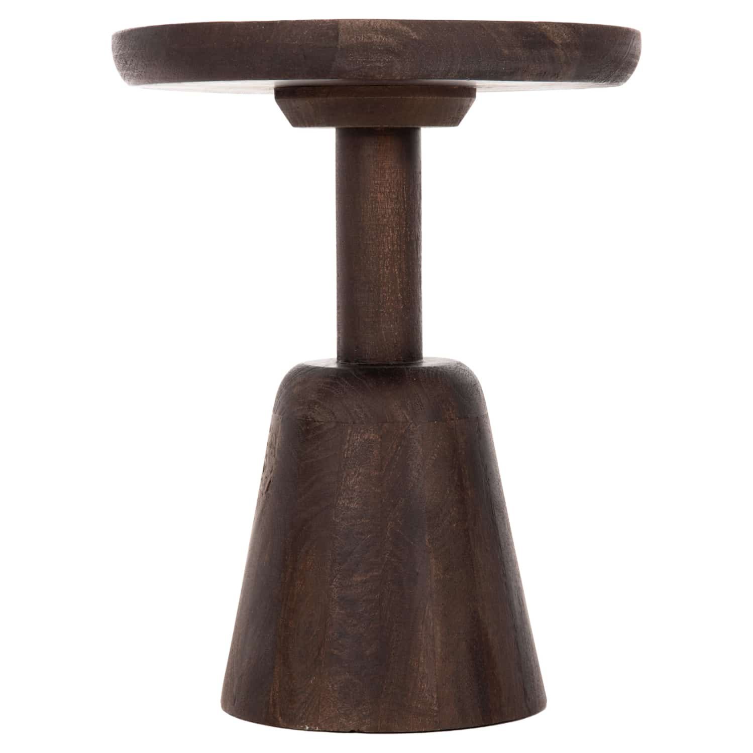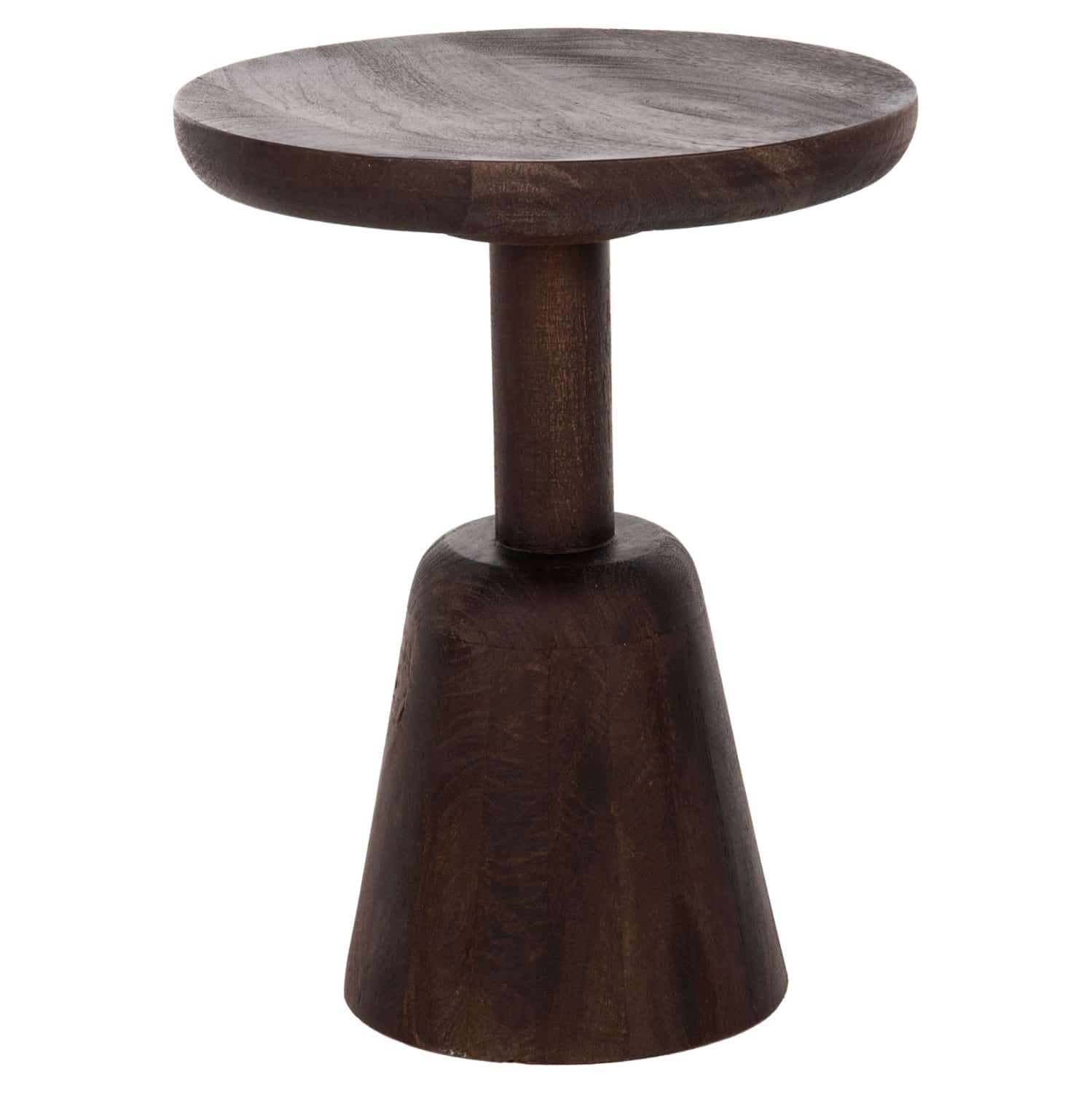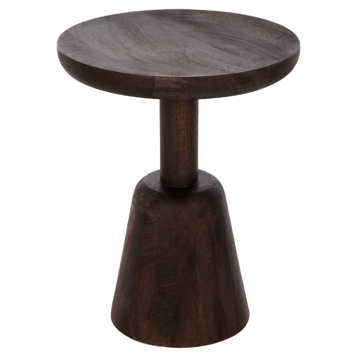 Το στρογγυλό τραπέζι σαλονιού CRABB που είναι εξολοκλήρου κατασκευασμένο από μασίφ ξύλο mango σε ΣΚΟΥΡΟ ΚΑΦΕ χρώμα μοιάζει με σκαμπό, χάρη στο κωνικό σχήμα της βάσης που καταλήγει στην στρογγυλή επιφάνεια. Ένα τραπέζι που θα εντυπωσιάσει με το σχήμα και το χρώμα του, αφού είναι sand blasted, προσδίδοντας εικόνα παλαιότητας στο έπιπλο.