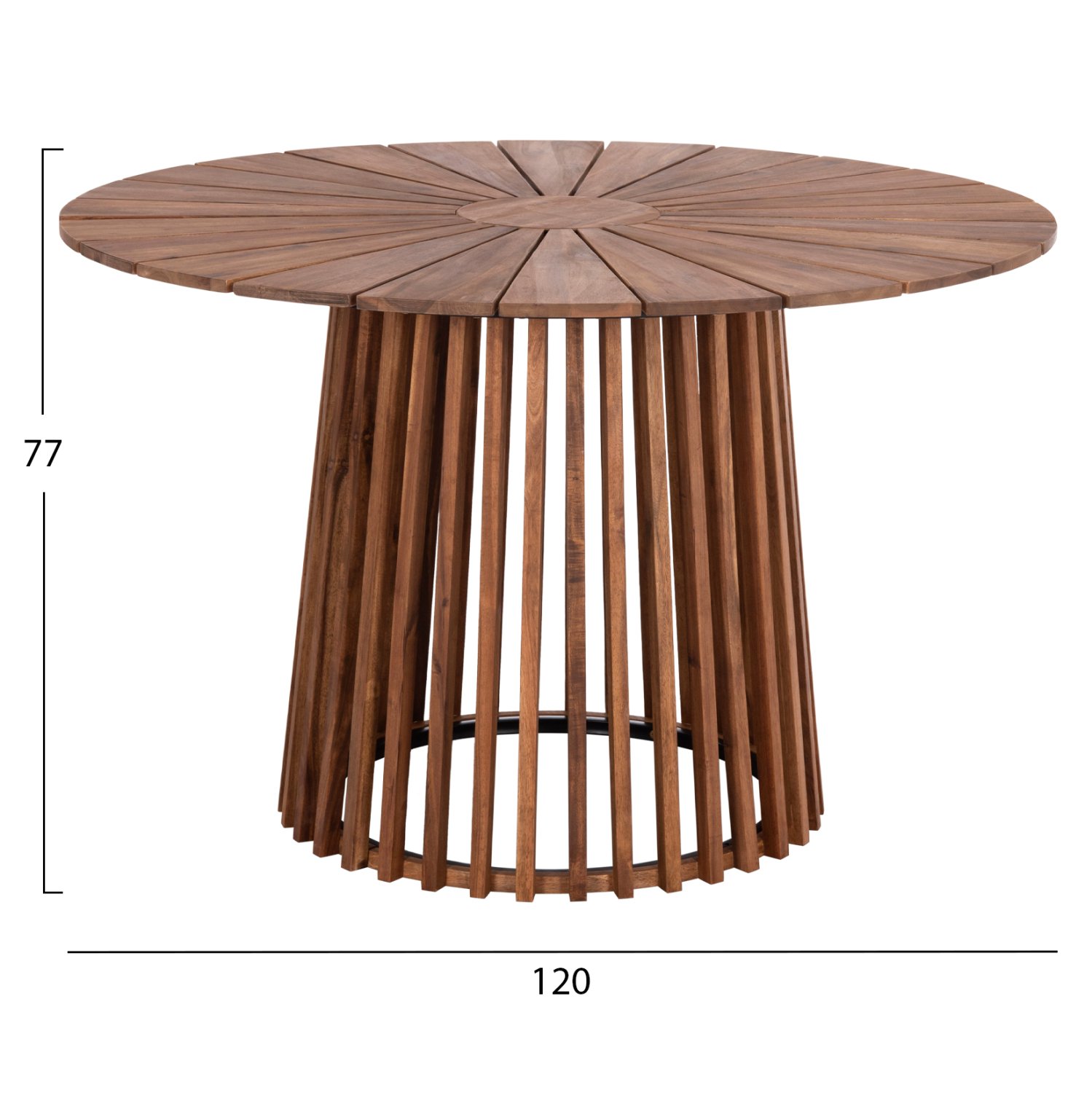 Το CRISTOBAL είναι ένα στρογγυλό τραπέζι τραπεζαρίας εξωτερικού χώρου σε μεσαία διάσταση σε φυσικό χρώμα ξύλου. Η επιφάνεια του τραπεζιού αποτελείται από «φέτες» ξύλου ακακίας και στηρίζεται σε μια ξύλινη κατασκευή στο κέντρο με πολλές δοκούς σε κυκλική διάταξη που ενώνονται μεταξύ τους με μεταλλικό σκελετό στην εσωτερική πλευρά. Αυτό το τραπέζι θα αναβαθμίσει αισθητικά την τραπεζαρία σας ενώ μπορεί να ταιριάξει με πολλά διαφορετικά στυλ και χρώματα στον τριγύρω χώρο, όπως και με διαφορετικά στυλ καρέκλας.