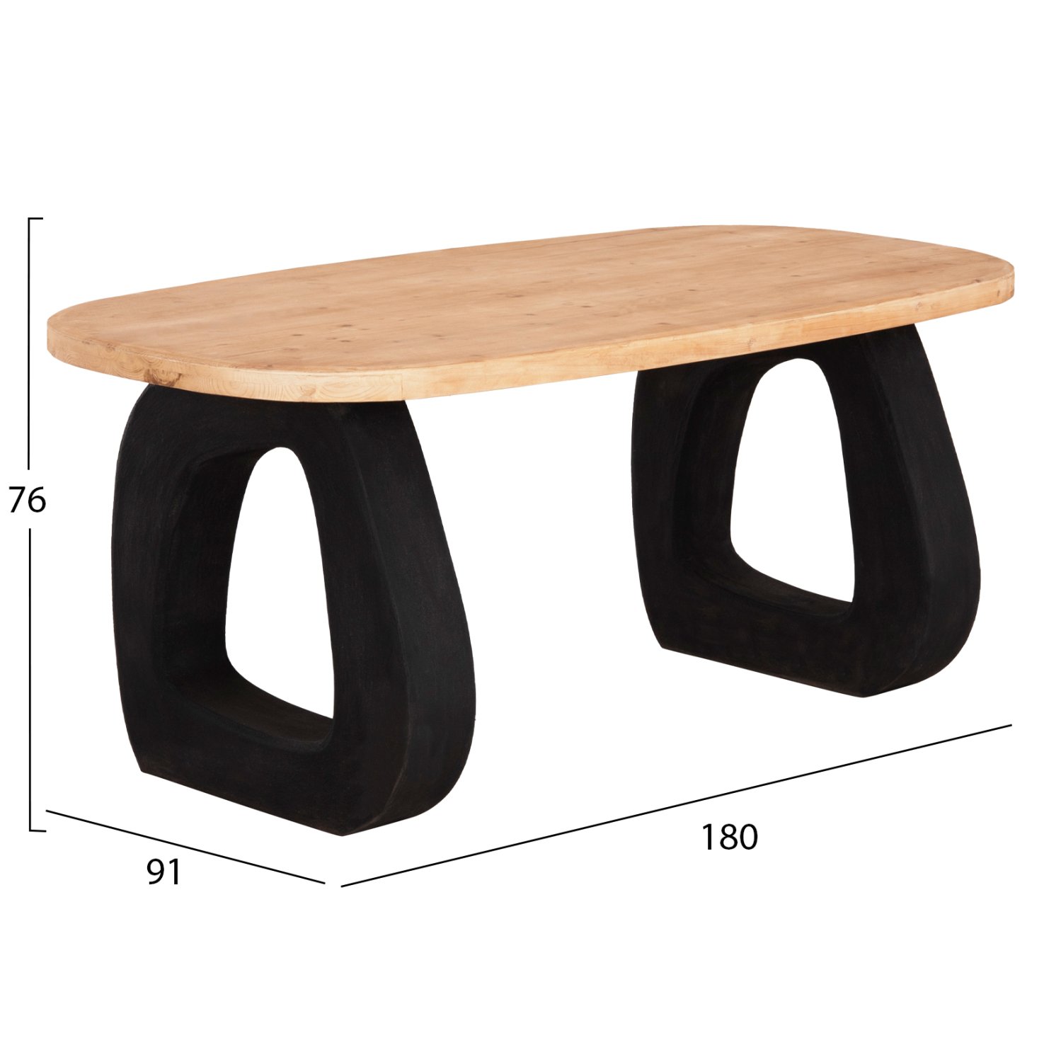 Το χειροποίητο τραπέζι αυτό είναι το μοναδικό στην γκάμα μας που συνδυάζει δύο εντελώς διαφορετικά μεταξύ τους υλικά, με απόλυτη αρμονία. Η επιφάνεια είναι σε σχήμα οβάλ και κατασκευασμένη από ξύλο ελάτου σε ΦΥΣΙΚΟ χρώμα, ενώ τα πόδια είναι σε στυλ βάσεων σε ΜΑΥΡΟ χρώμα από πολυρητίνη με υφή σαγρέ τσιμέντου, που αποτελεί την πιο σύγχρονη τάση στον τομέα του interior design. Ενδεικνυται για μια “νησιωτικού” στυλ διακόσμηση!