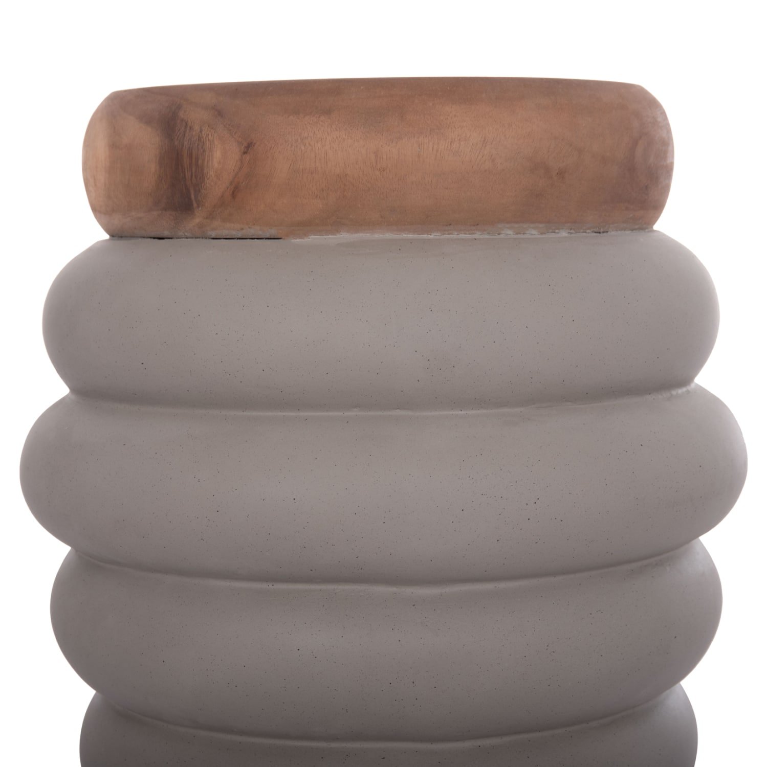 Το βοηθητικό τραπέζι σαλονιού PUFFAT είναι κυλινδρικό με όμορφο σχέδιο δακτυλίων και επιφάνεια από ποιοτικό ξύλο teak. Είναι κατασκευασμένο εξολοκλήρου από Fiber Cement σε ΓΚΡΙ χρώμα και αποτελεί ιδανικό συμπλήρωμα τόσο για το σπίτι, όσο και για επαγγελματικούς χώρους, όπως ξενοδοχεία, AirBnB, κτλ.