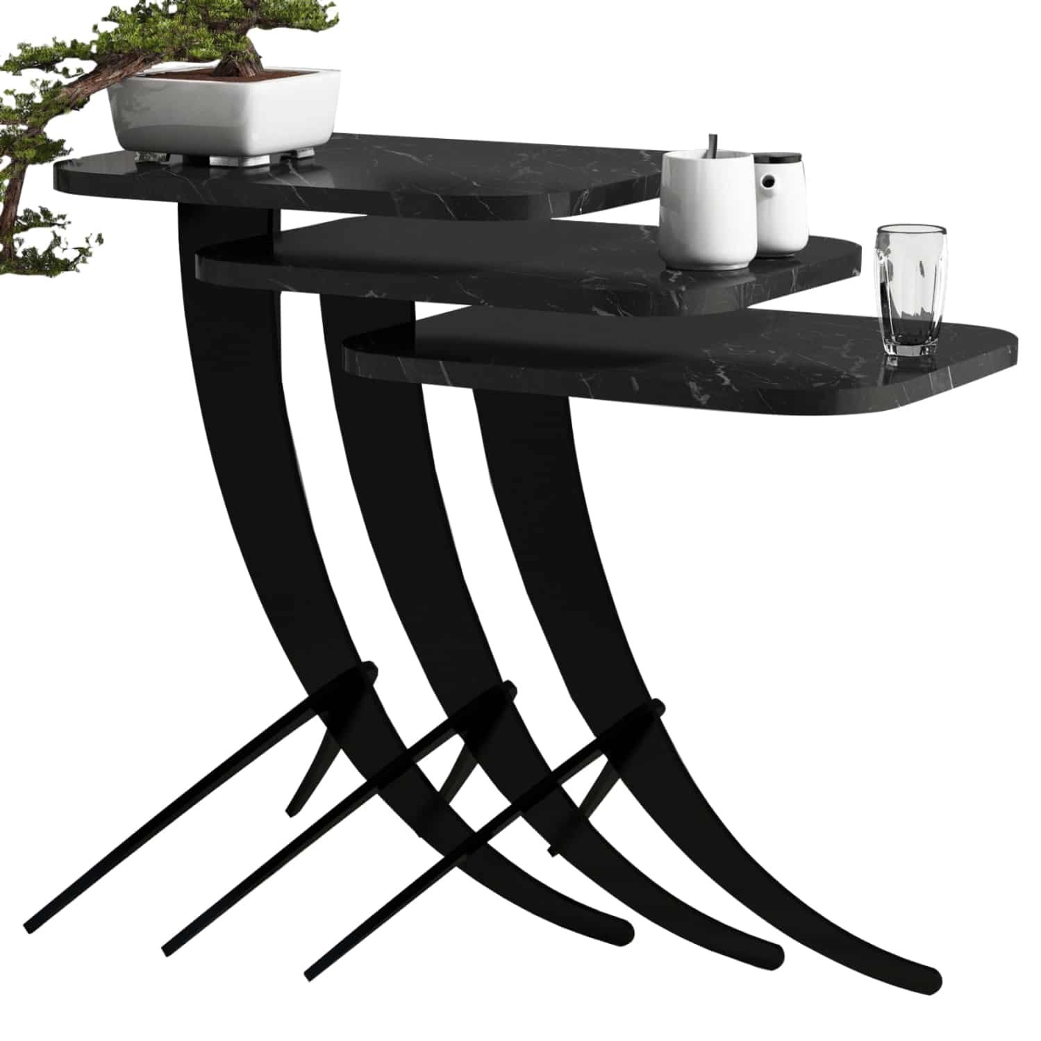 ΗΜ9508.02 τραπεζάκια σαλονιού—– Τα τραπεζάκια ζιγκόν θα σας ενθουσιάσουν με το στυλ και την πρακτικότητά τους. Μπορείτε να δημιουργήσετε πρωτότυπες διακοσμητικές συνθέσεις, δίνοντας νέα πνοή στον χώρο σας με αυτό το σετ. Πρόκειται για 3 τραπεζάκια με επιφάνεια μελαμίνης με όψη ΜΑΥΡΟΥ ΜΑΡΜΑΡΟΥ που αποθηκεύονται το ένα κάτω από το άλλο. Τα εντυπωσιακά πόδια, είναι μεταλλικά σε μαύρο χρώμα και αποτελούν το χαρακτηριστικό γνώρισμα αυτού του σετ.