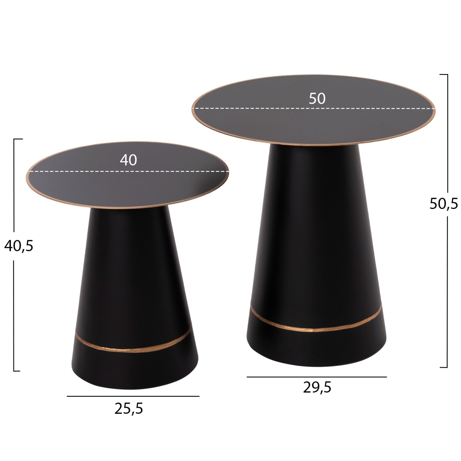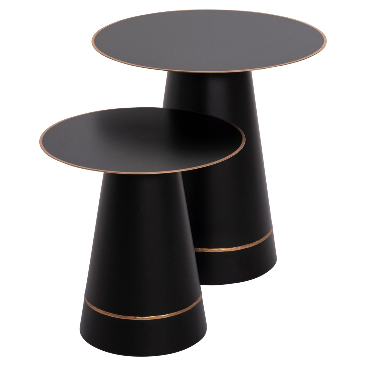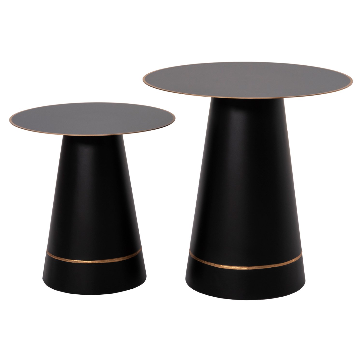 Το σετ 2 τραπεζιών BALLI για το σαλόνι είναι μια από τις νέες προσθήκες στην γκάμα μας. Πρόκειται για 2 μεταλλικά τραπεζάκια στρογγυλά με κωνική βάση και flat επιφάνειες σε ΜΑΥΡΟ ματ χρώμα. Οι χρυσές λεπτομέρειες τόσο στις επιφάνειες, όσο και στις βάσεις δίνουν μια όμορφη όψη στα τραπέζια. Ιδανικά τόσο για το σπίτι, όσο και για επαγγελματικούς χώρους.