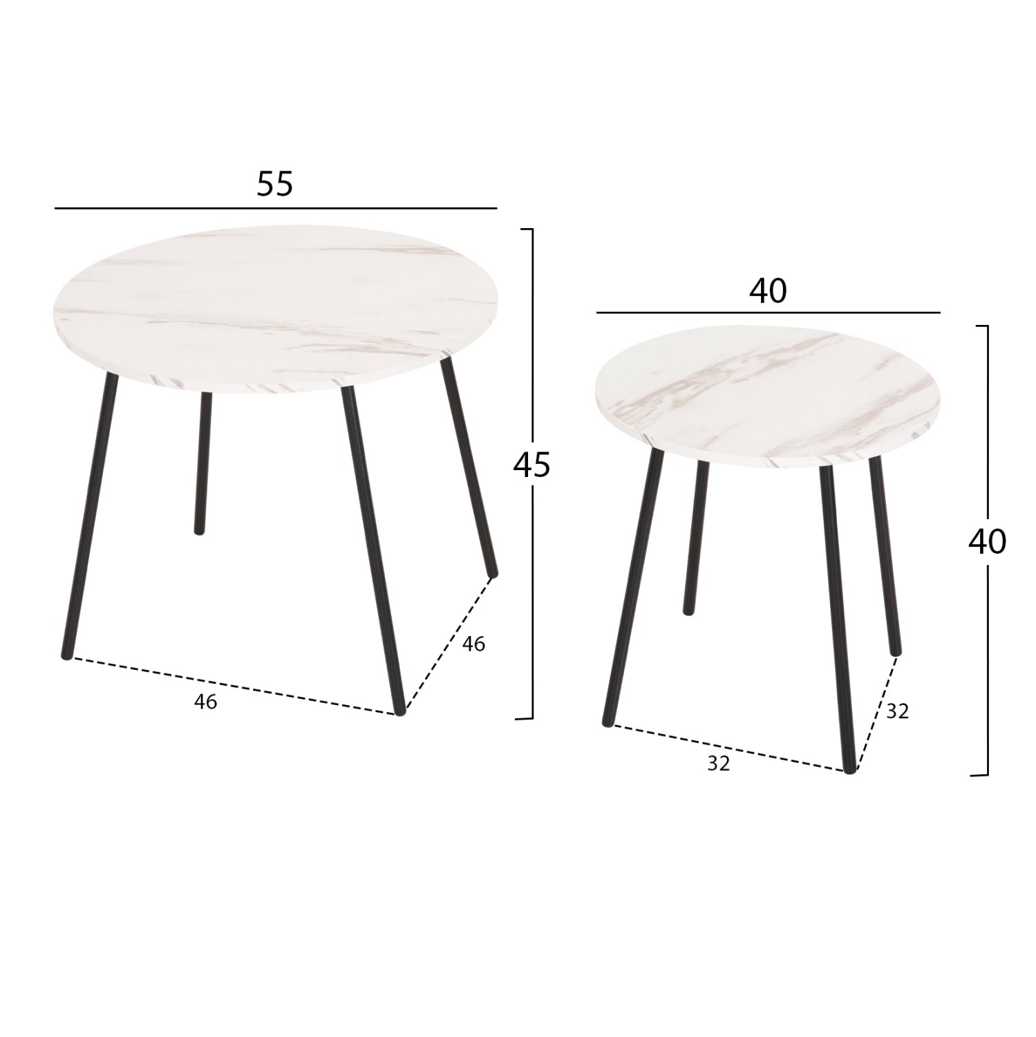 Τα τραπεζάκια ζιγκόν CUPPER θα σας ενθουσιάσουν με το στυλ και την πρακτικότητά τους. Μπορείτε να δημιουργήσετε πρωτότυπες διακοσμητικές συνθέσεις, δίνοντας νέα πνοή στον χώρο σας με αυτό το σετ. Πρόκειται για 2 στρογγυλά τραπέζια, ένα ψηλότερο κι ένα πιο κοντό που αποθηκεύεται κάτω από το ψηλό. Τα πόδια είναι μεταλλικά σε μαύρο χρώμα, ενώ οι επιφάνειές τους είναι σε χρώμα ΛΕΥΚΟ ΜΑΡΜΑΡΟ.