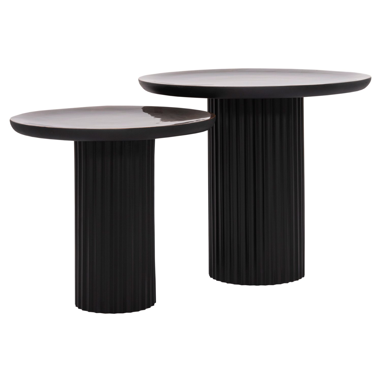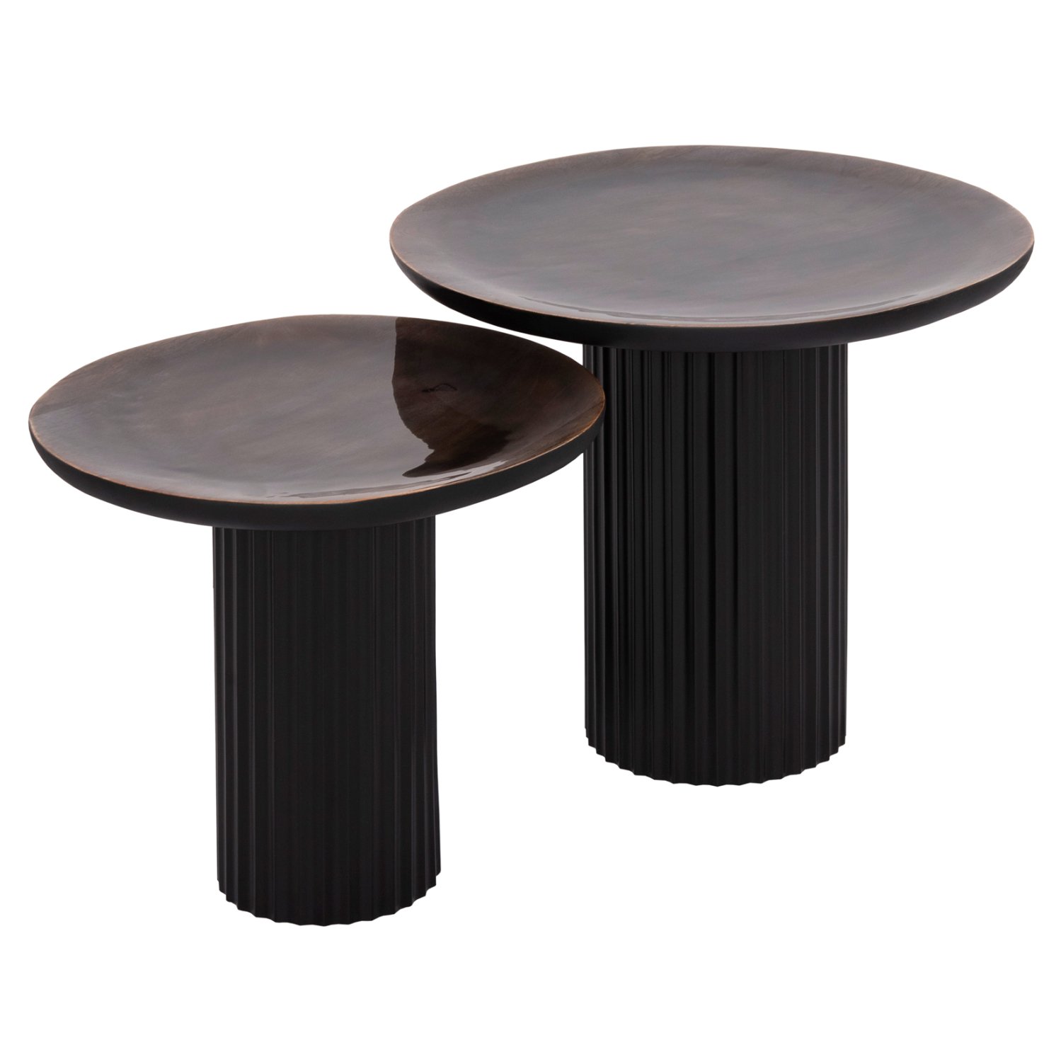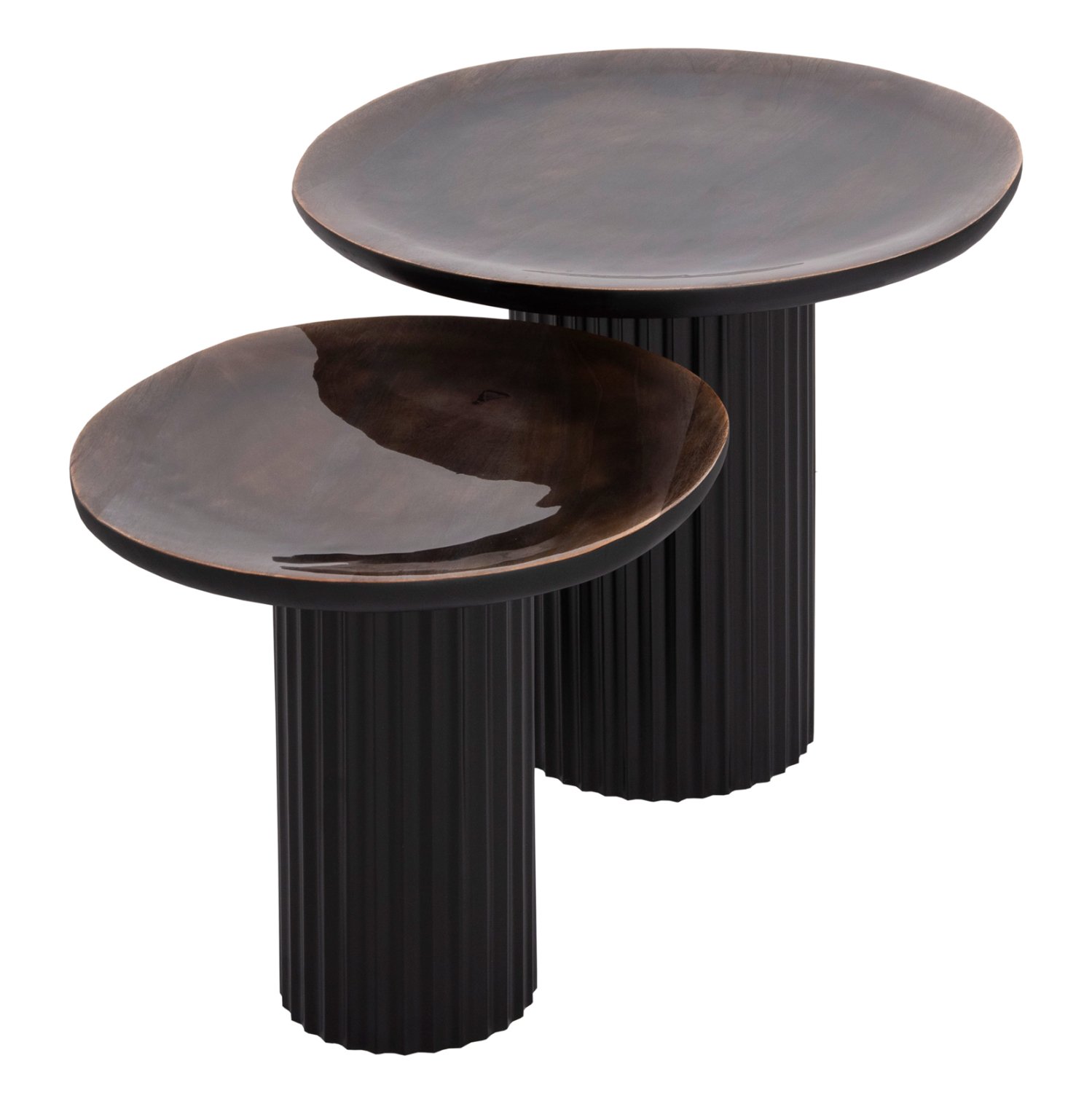 Το ELAF είναι ένα σετ που αποτελείται από 2 τραπέζια σαλονιού με πολύ ιδιαίτερο design αλλά και υλικά κατασκευής. Οι σχεδόν στρογγυλές επιφάνειες είναι από ξύλο mango σε καφέ χρώμα, και σε εμαγιέ ημιδιάφανη υλοποίηση. Οι βάσεις είναι μεταλλικές σε μαύρο χρώμα με πτυχωτό σχέδιο. Τα διαφορετικά ύψη τονίζουν την πρακτικότητα αυτού του σετ που θα καλύψει τις ανάγκες στο σαλόνι σας.