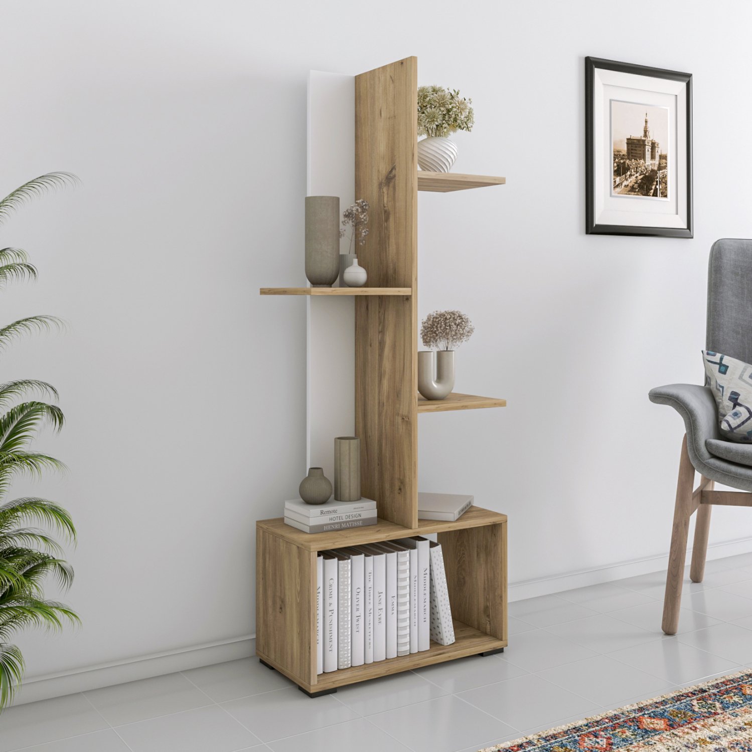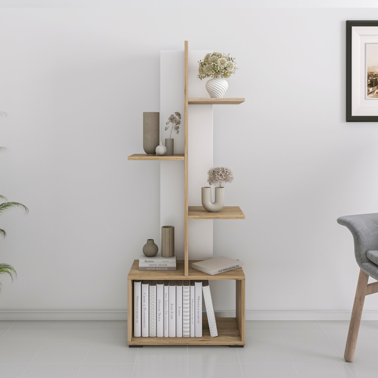 Ολόκληρη η βιβλιοθήκη είναι κατασκευασμένη από εξαιρετικής ποιότητας μελαμίνη πάχους 18mm. Η μελαμίνη είναι είδος ξύλου σε μορφή μοριοσανίδας(panel) πολύ ανθεκτική και με μεγάλη σκληρότητα. Άρα, πρόκειται για ένα συνθετικό υλικό με πολύ σκληρή επιφάνεια, με αποτέλεσμα να είναι πολύ ανθεκτική στις γρατζουνιές, στην τριβή και τους λεκέδες.