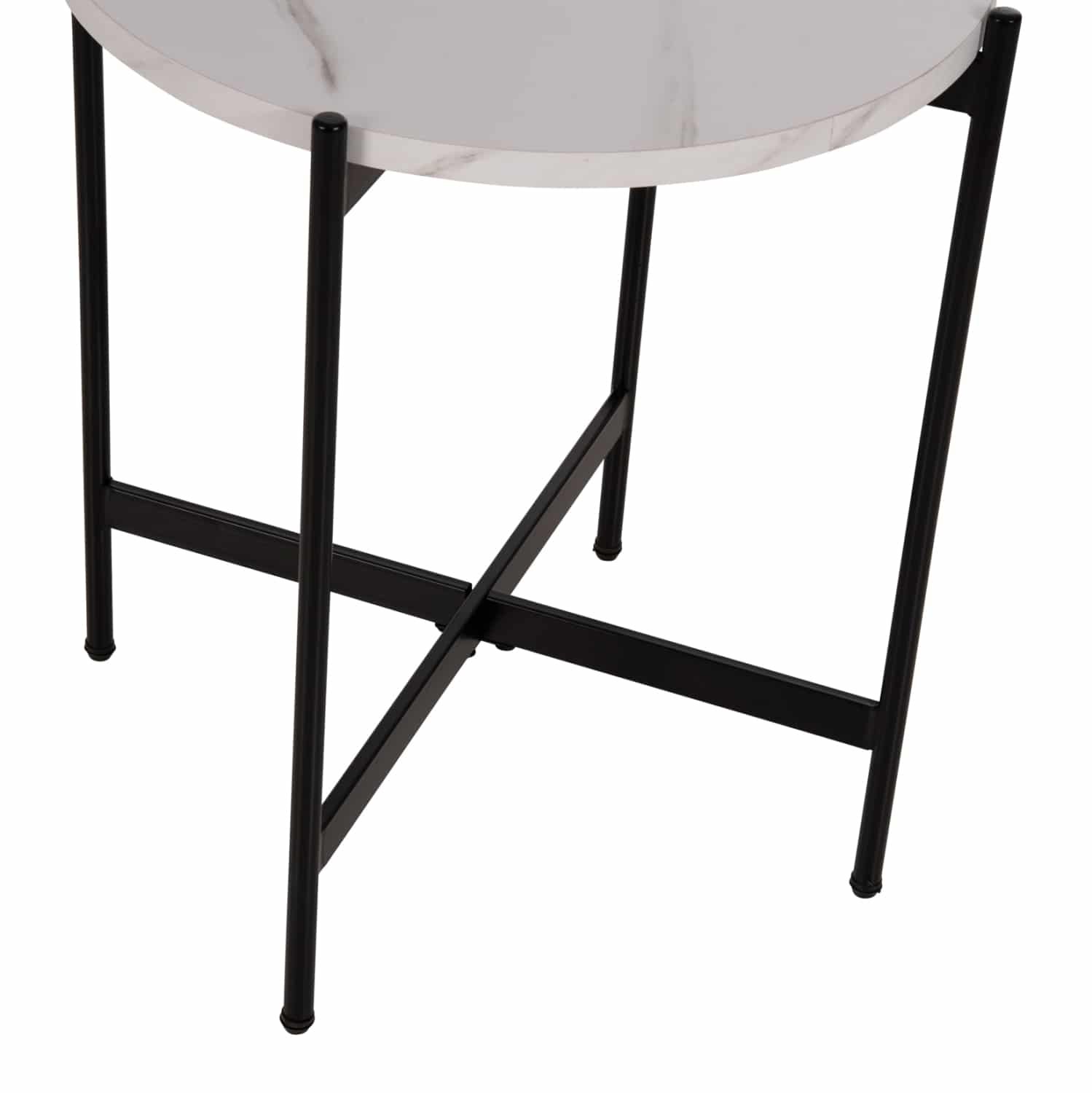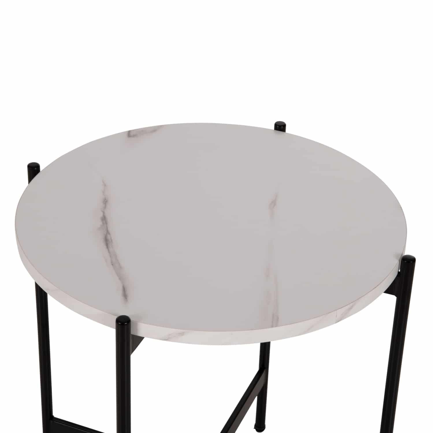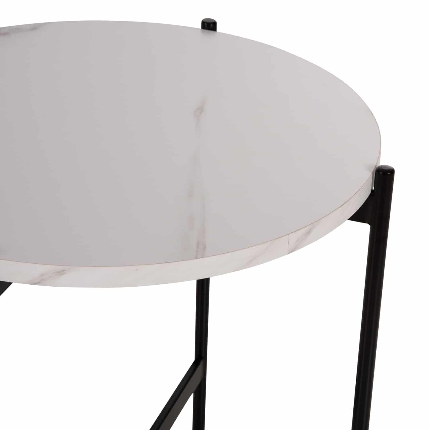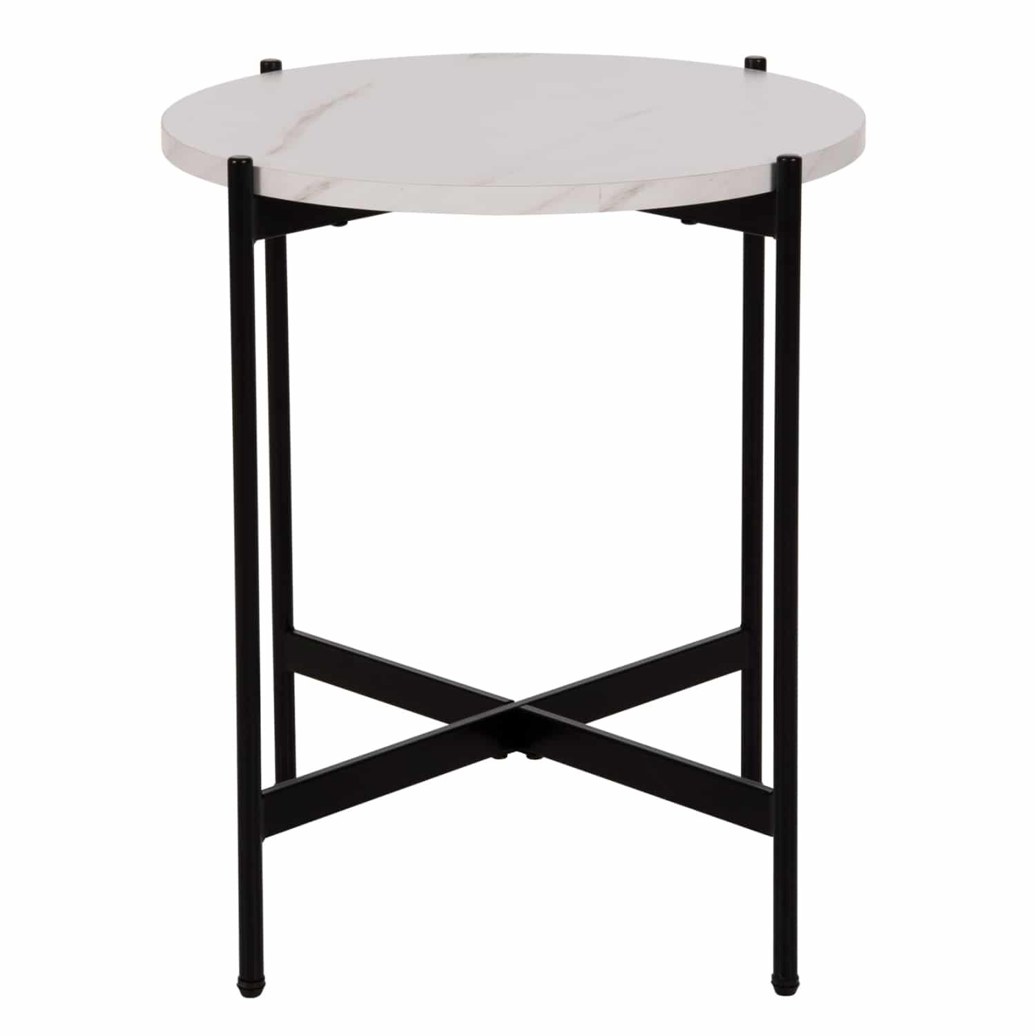 Το βοηθητικό τραπεζάκι ΗΜ9589.05 θα σας ενθουσιάσει με το στυλ και την πρακτικότητά του. Πρόκειται για ένα στρογγυλό ψηλό σχετικά τραπεζάκι με ιδιαίτερο χαρακτηριστικό ότι η επιφάνεια στηρίζεται σε μια βάση με χιαστί διάταξη. Η βάση είναι μεταλλική σε ΜΑΥΡΟ χρώμα, ενώ η επιφάνεια είναι κατασκευασμένη από MDF σε χρώμα ΛΕΥΚΟ ΜΑΡΜΑΡΟ.