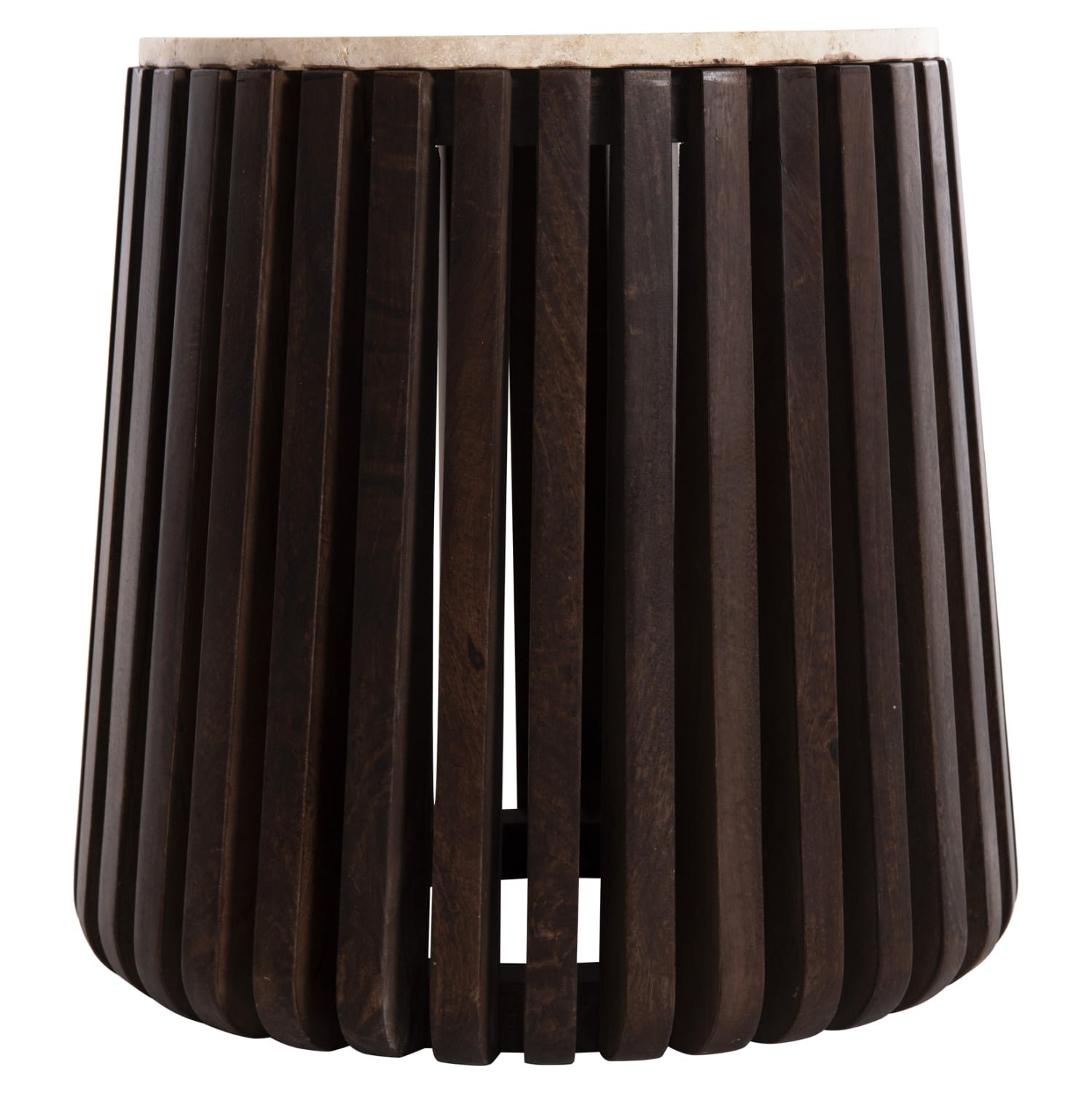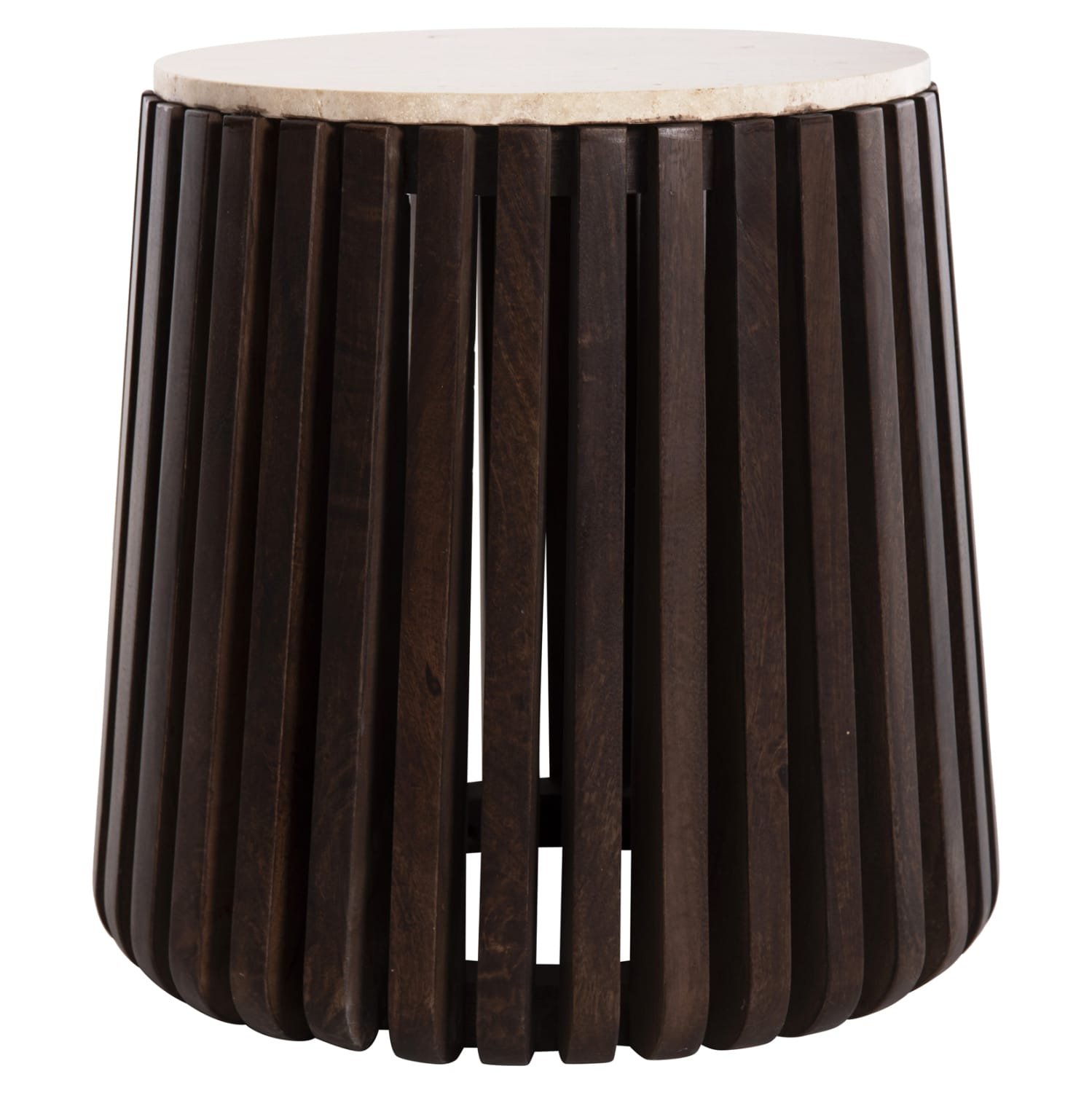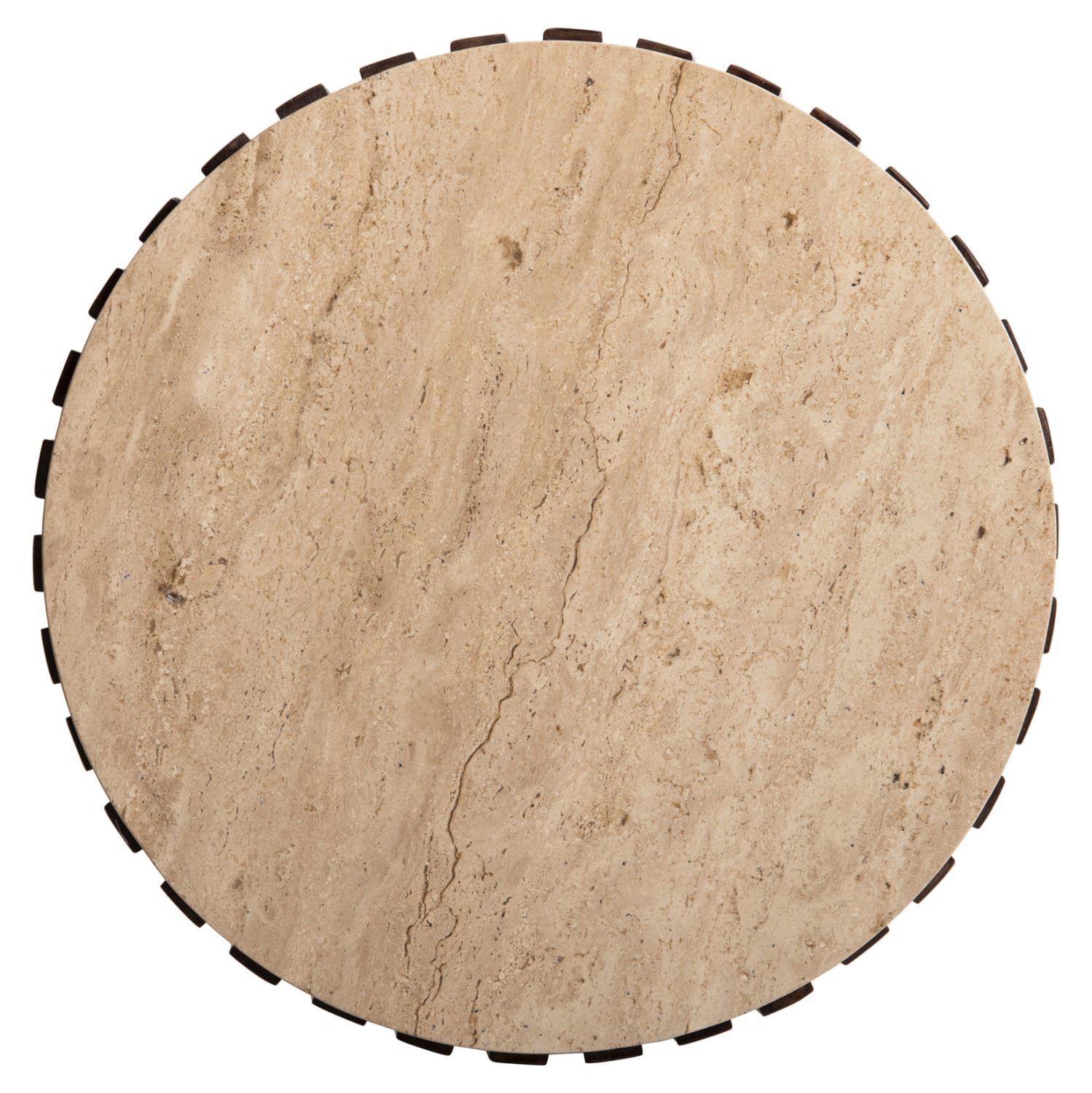 Το KREST είναι ένα στρογγυλό βοηθητικό τραπέζι για το σαλόνι σε ΚΑΦΕ χρώμα με επιφάνεια από τραβερτίνα στο ΛΕΥΚΟ της χρώμα. Αποτελείται από ξύλινες δοκούς σε κωνική διάταξη που καταλήγουν σε μια κυκλική βάση, πάνω στην οποία τοποθετείται η πέτρινη επιφάνεια. Πρόκειται για ένα πολυτελέστατο βοηθητικό τραπέζι για το σαλόνι σας που θα τραβήξει τα βλέμματα!